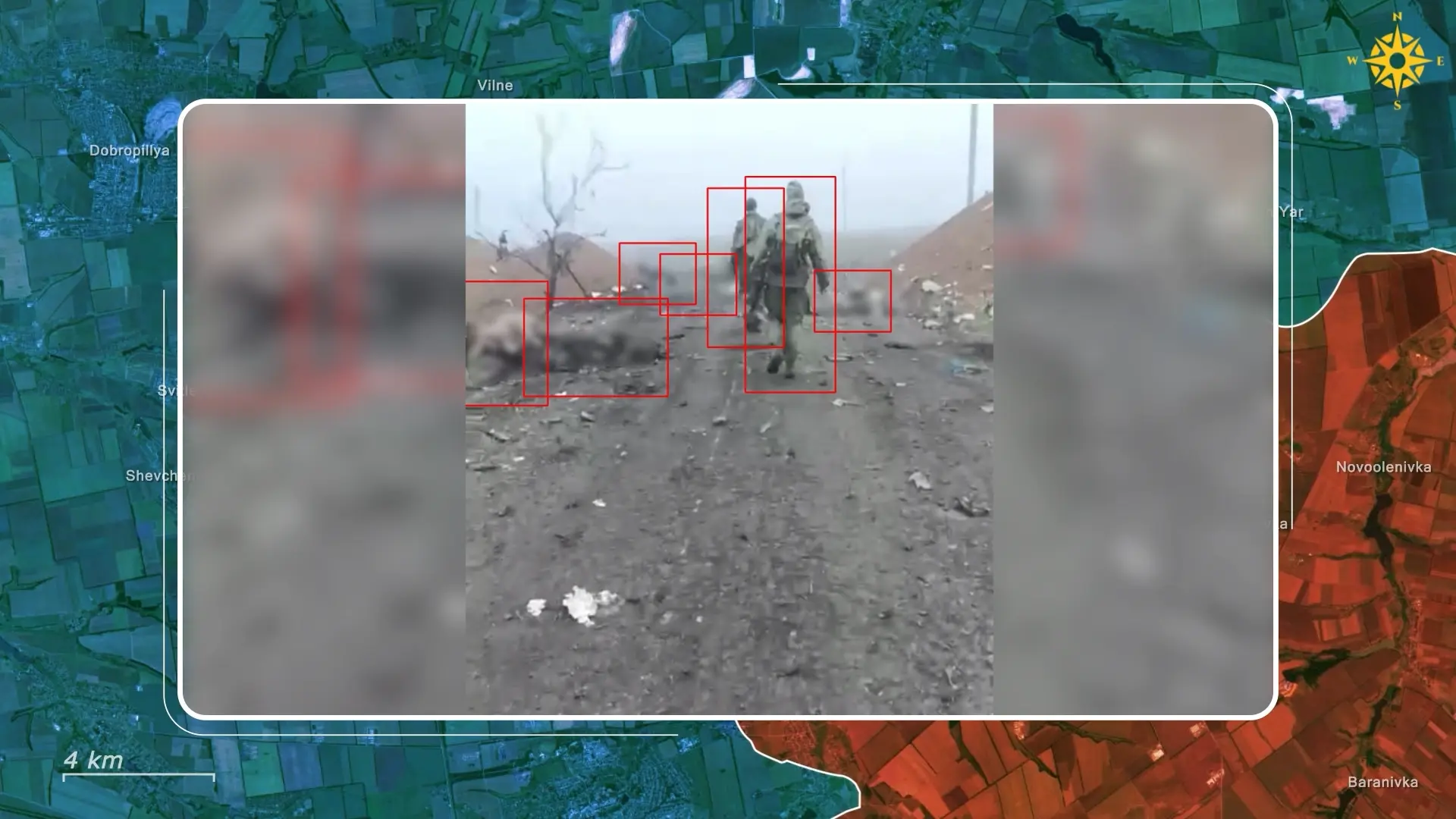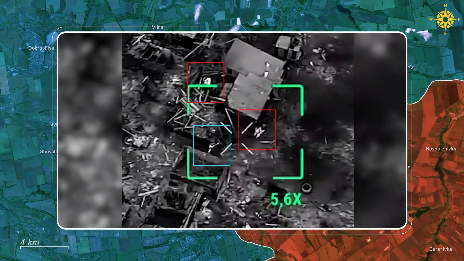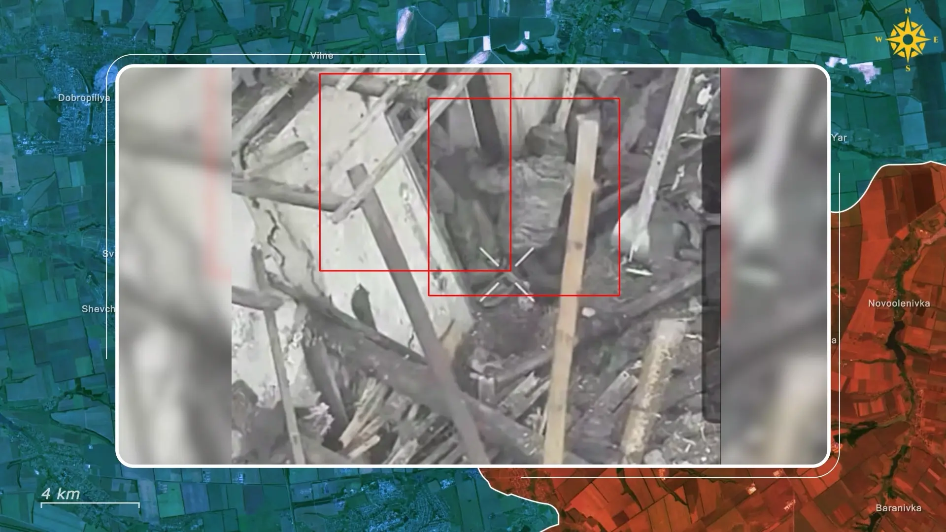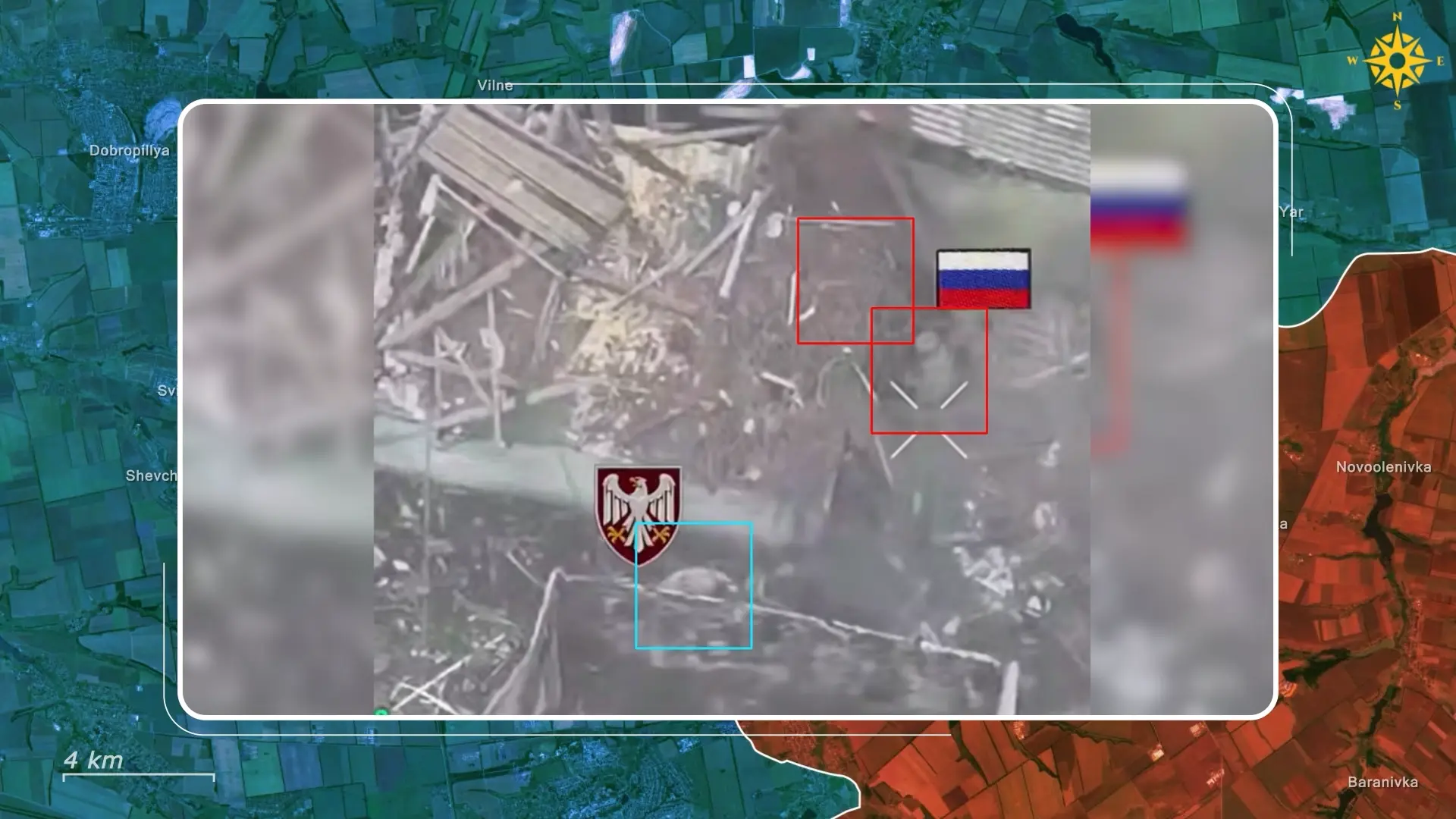 Ukrainian drone footage from the ruins of Volodymyrivka illustrates the battles that now define the sector. In one clip, two Russian soldiers attempt to advance through collapsed buildings while being tracked from a Ukrainian drone above. A lone Ukrainian paratrooper suddenly appears from behind rubble, engaging them at close range with small arms fire.