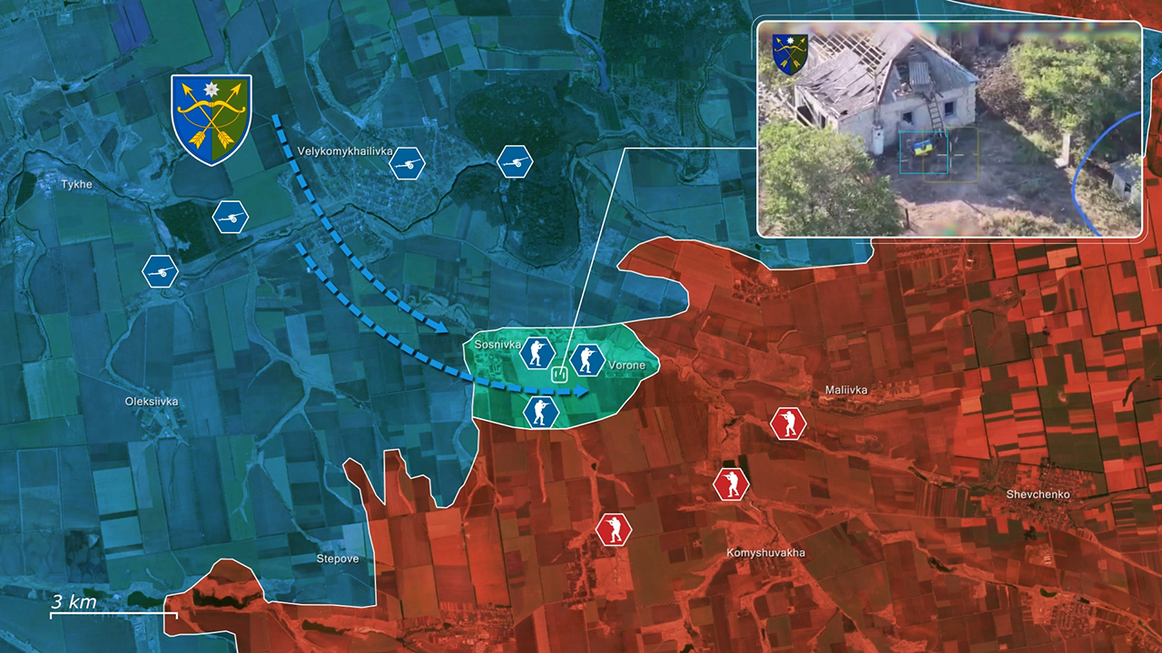 To the south, where Russian forces had started advancing rapidly through a series of tree lines, Ukrainian counterattacks, have recaptured Sosnivka, Vorone, and several nearby hamlets. These counterattacks were preceded by an intense coordinated artillery barrage, suppressing and eliminating Russian infantry moving unprotected in the open.