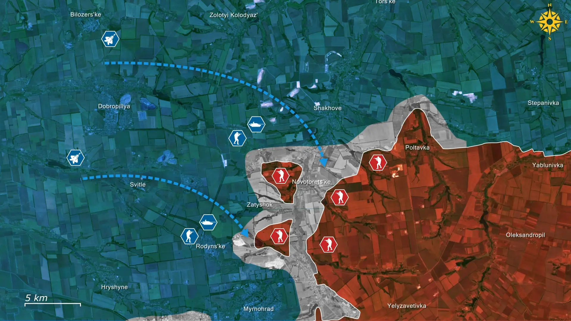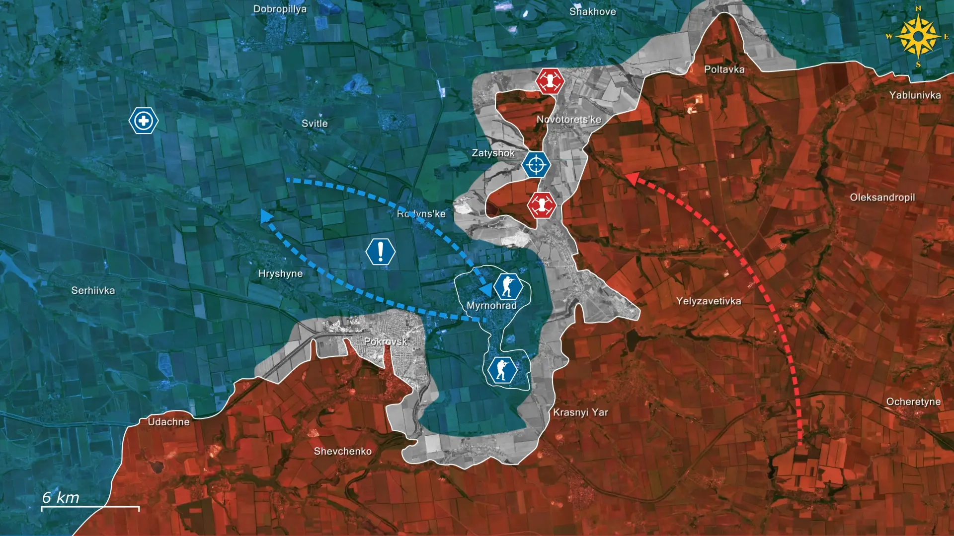 This first stage of the plan was completed with remarkable coordination. Ukrainian troops conducted the rotation and partial withdrawal from the semi-encircled town with no losses. The counterattack to the north drew away Russian reconnaissance assets, allowing evacuation convoys to move through safely under electronic countermeasures. Part of the soldiers were safely extracted behind the frontlines, while the remaining defenders in Myrnohrad resupplied and prepared to hold the new line.