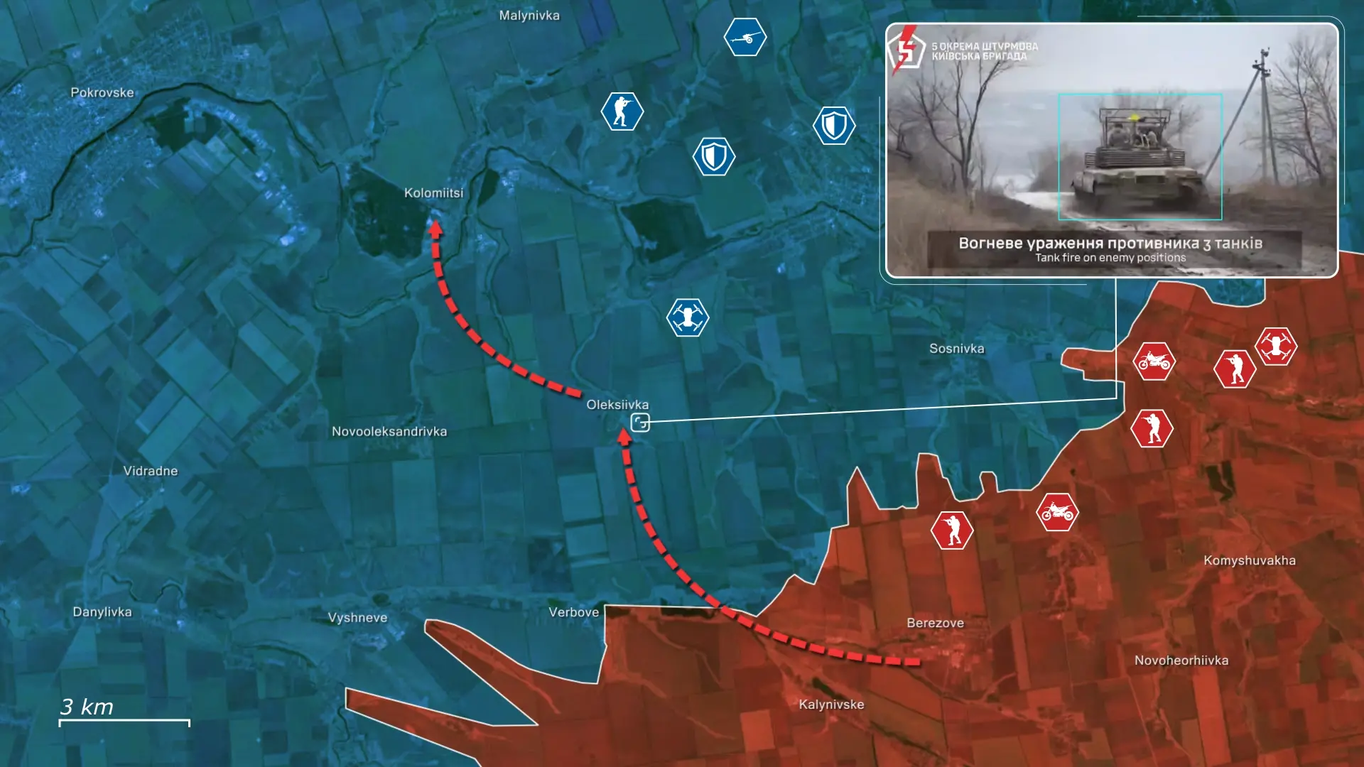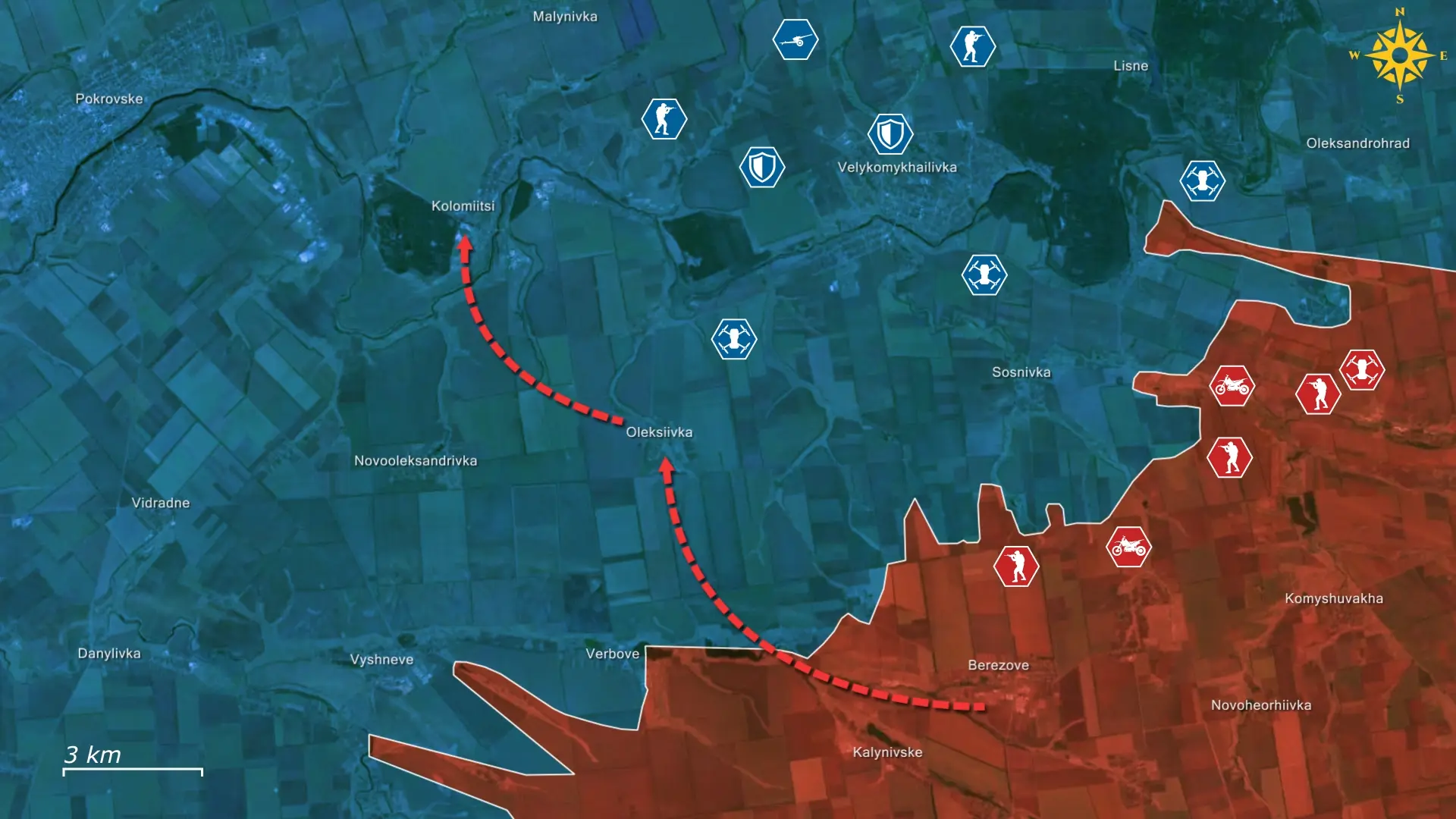 Velykomykhailivka and the high grounds behind serve as a shield, as they are followed by open fields, which are harder to defend and would benefit the Russians if they manage to break through. Because of the disadvantages of the terrain, the Russian command has come up with a plan to outflank the defense and avoid a costly frontal assault. They will try to semi-encircle Velykomykhailivka by moving through Oleksiivka towards Kolomiitsi and then starve the well-protected town by exerting fire control over the logistics route to Pokrovske and by shelling Velykomykhailivka itself.