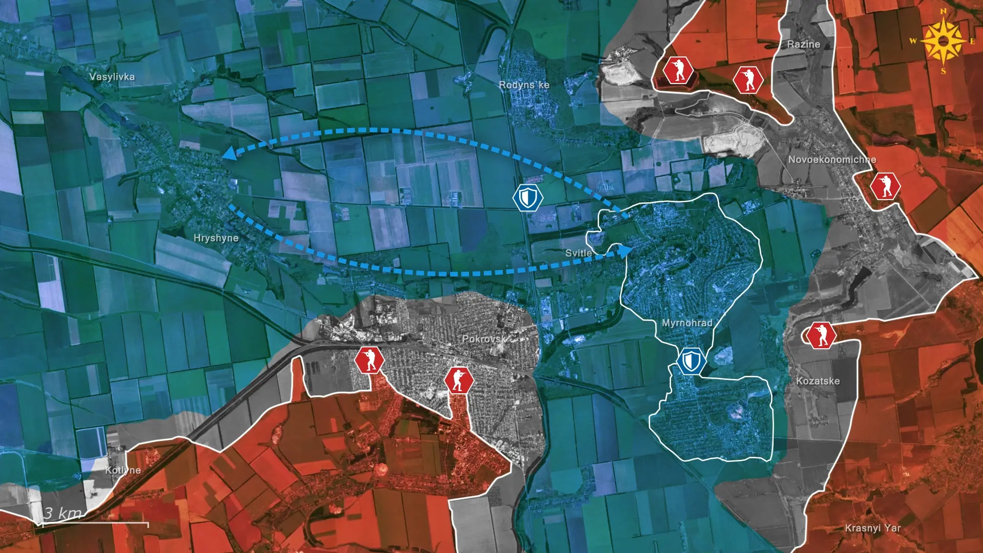 Its clear zones reduce the risk of surprise infiltration and allow Ukrainian posts and drone operators to monitor every approach route. By keeping the Russians south of the tracks, Ukrainian forces protect the northern logistics corridor toward Myrnohrad, their most important task at the moment.