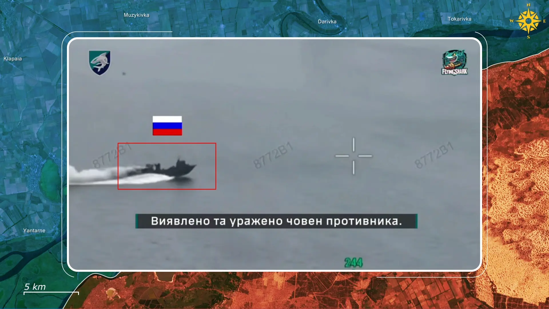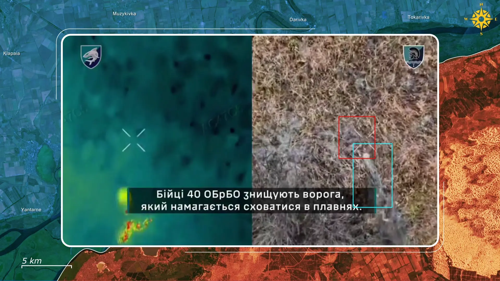 Geolocated footage shows Ukrainian aerial reconnaissance identifying enemy motorboats moving between islands and then striking them on the move. Surviving troops attempted to escape by swimming to the shore and concealing themselves in the reeds, but were later eliminated through additional drone strikes.