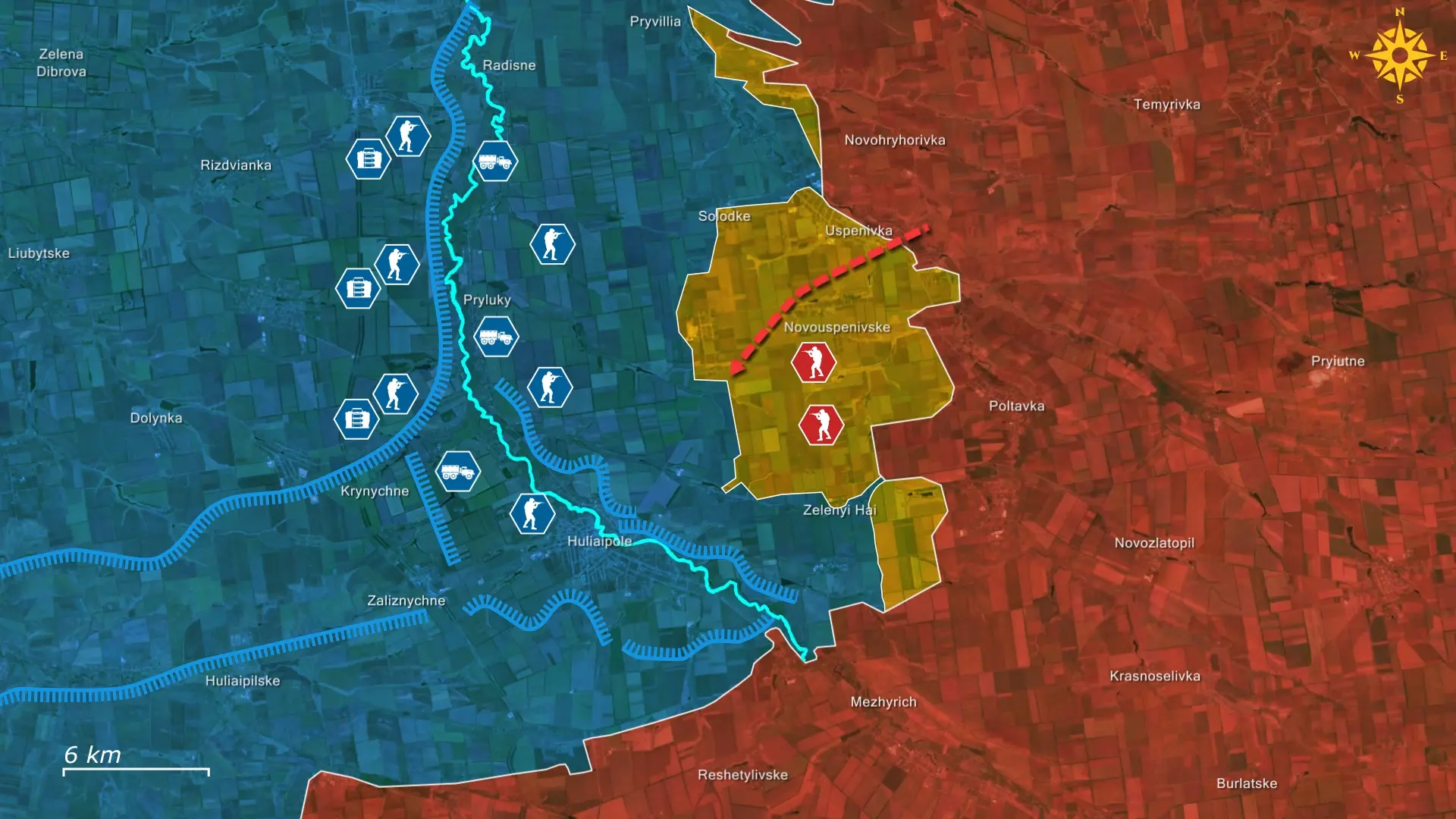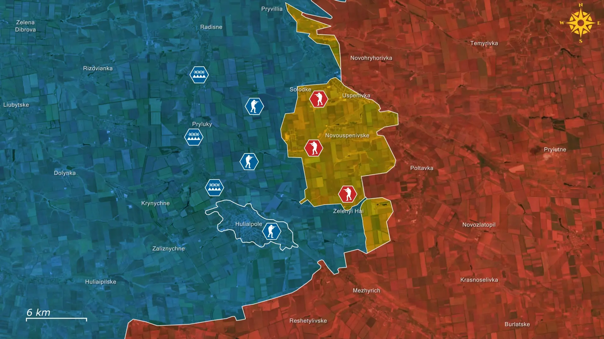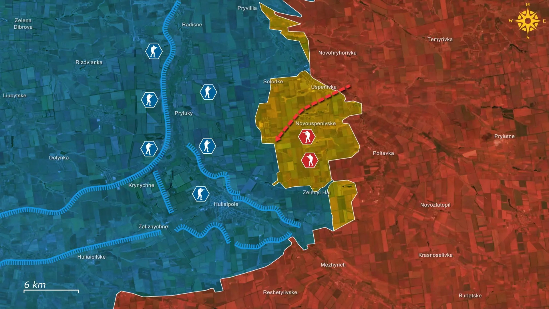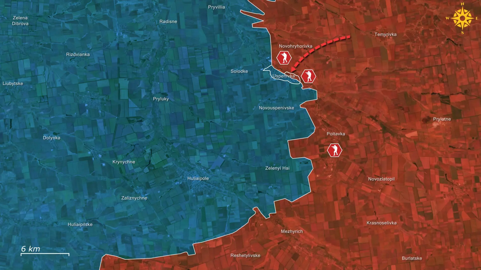 Nach ihrem konzentrierten Vorstoß nahmen die russischen Streitkräfte Uspeniwka ein und öffneten damit einen breiten operativen Raum nördlich von Huliaipole. Die verstreuten Dörfer auf den Feldern zwischen den beiden Flüssen wurden rasch zu exponierten Zielen für die vierzigtausend Mann starken russischen Reserven, die das Gebiet schneller überfluteten, als ukrainische Drohnen sie vernichten konnten. Dennoch halten Solodke und Selenyj Hai weiterhin stand, da sie näher an den ukrainischen Versorgungsrouten liegen.