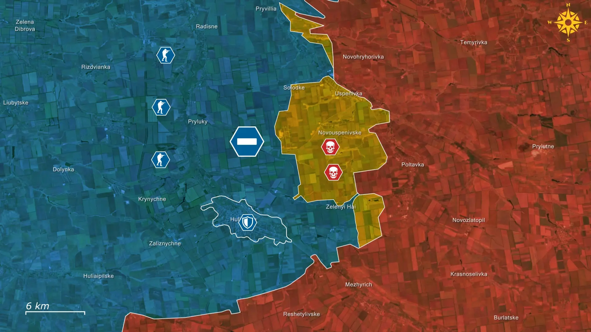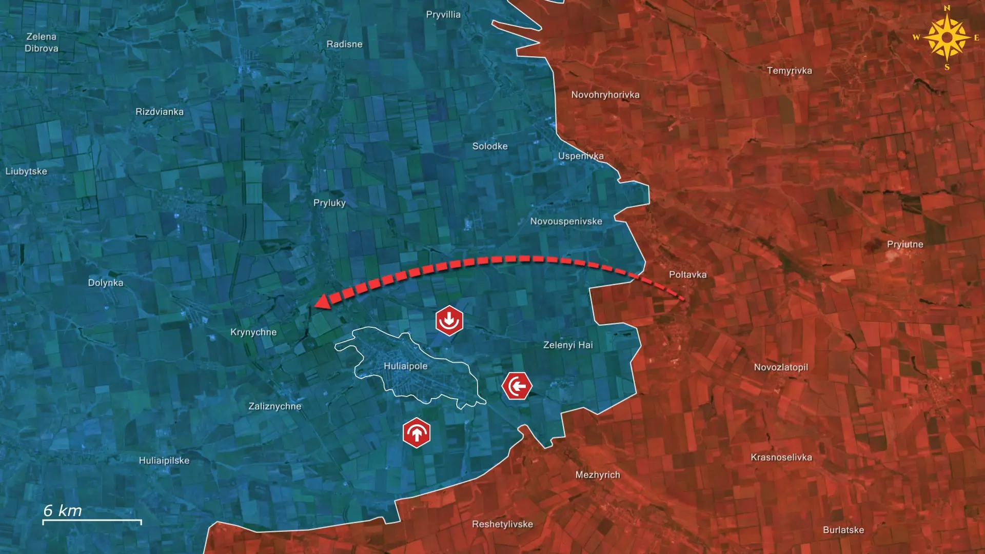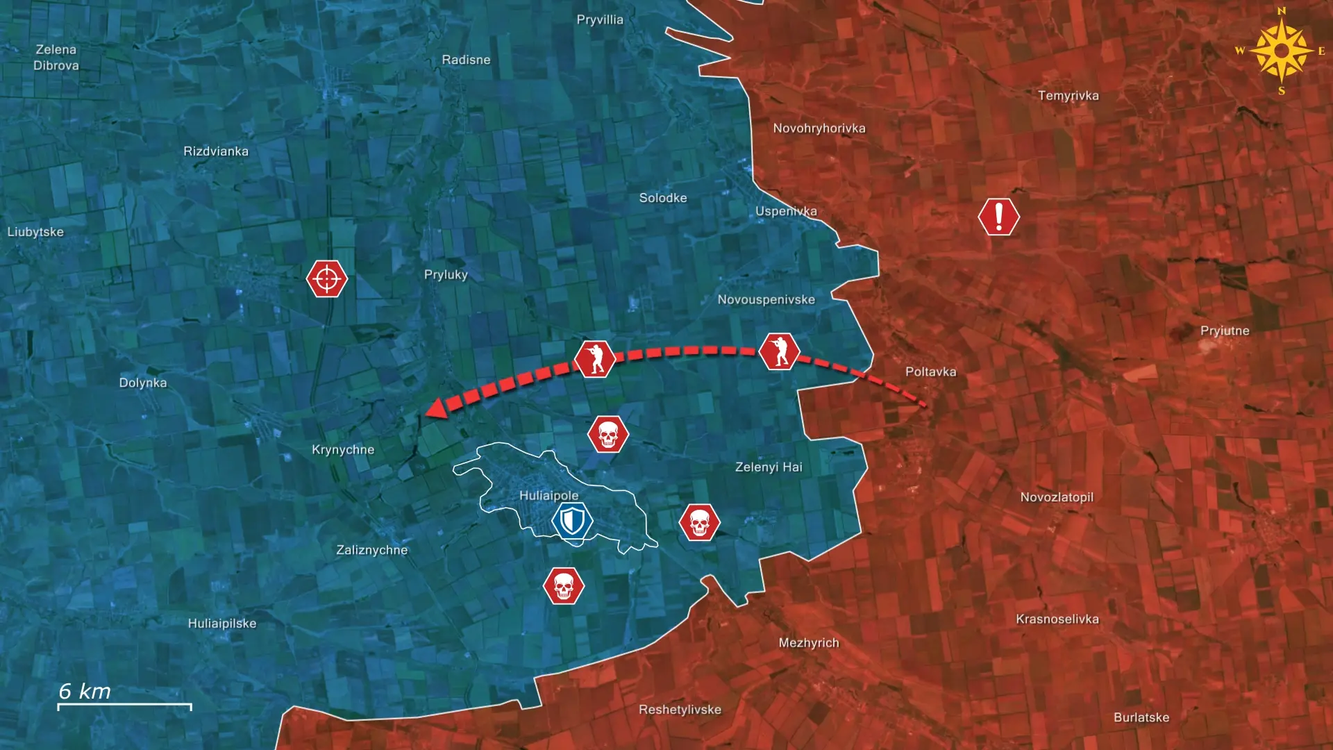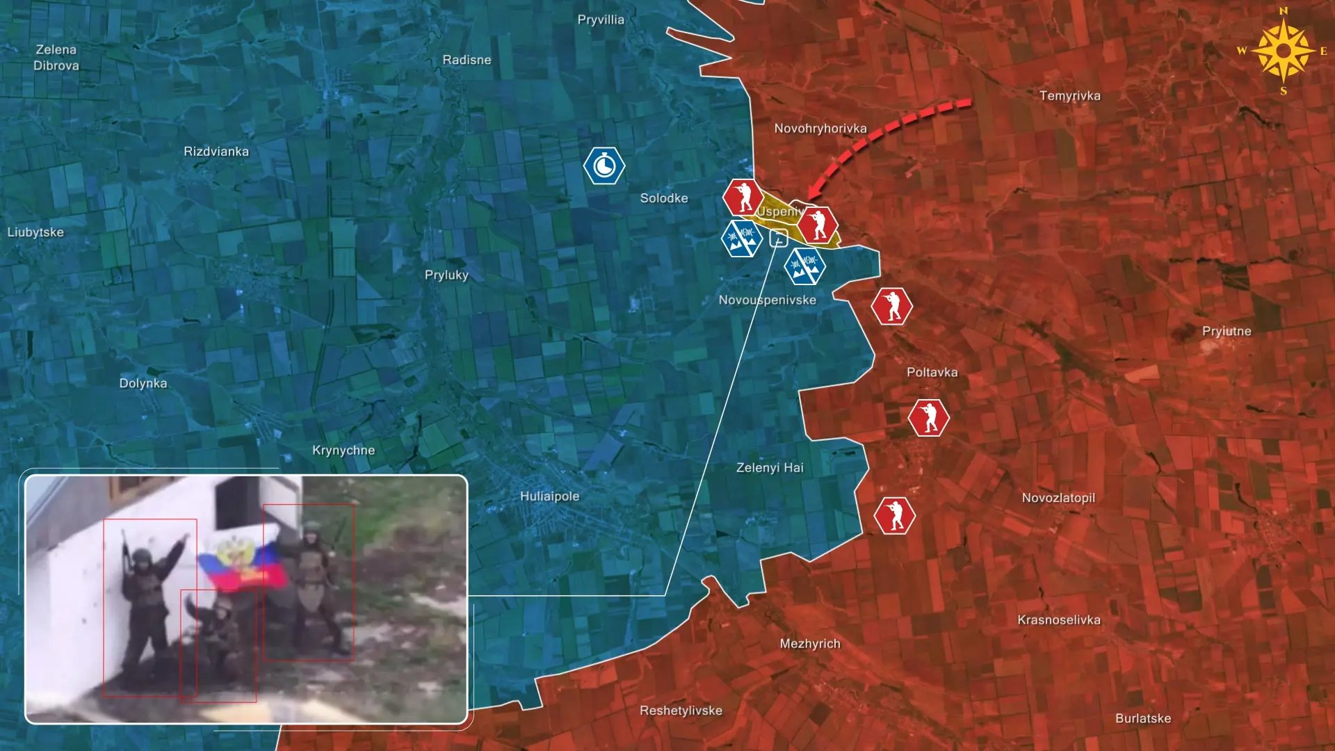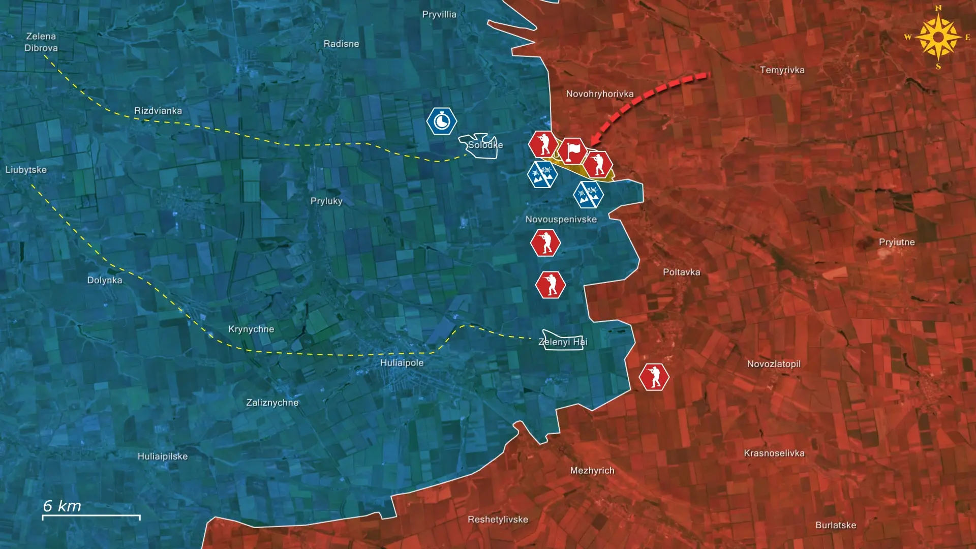 Nach ihrem konzentrierten Vorstoß nahmen die russischen Streitkräfte Uspeniwka ein und öffneten damit einen breiten operativen Raum nördlich von Huliaipole. Die verstreuten Dörfer auf den Feldern zwischen den beiden Flüssen wurden rasch zu exponierten Zielen für die vierzigtausend Mann starken russischen Reserven, die das Gebiet schneller überfluteten, als ukrainische Drohnen sie vernichten konnten. Dennoch halten Solodke und Selenyj Hai weiterhin stand, da sie näher an den ukrainischen Versorgungsrouten liegen.
