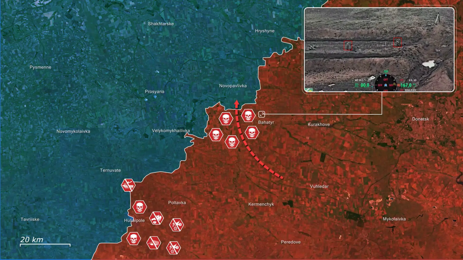 Eine weitere russische Angriffsgruppe versuchte, mit einem Schützenpanzer nördlich von Huljai-Pole vorzustoßen, um Infanterie abzusetzen. Geolokalisiertes Videomaterial belegt die Zerstörung des Fahrzeugs vor Erreichen des Einsatzziels. Die abgesessenen Truppen, die in einem Rohrsystem Deckung suchten, wurden in der Folge von ukrainischen FPV-Drohnen erfasst und eliminiert. Was als mechanisierter Vorstoß begann, löste sich rasch auf und endete im Totalverlust einer kompletten russischen mechanisierten Kompanie.