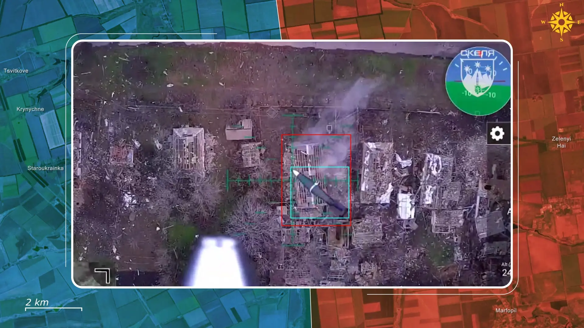 Geolokalisierte Aufnahmen zeigen, wie eine Operation des Skala-Regiments ablief. Zunächst entdeckten ihre Kommandeure mithilfe einer ukrainischen Aufklärungsdrohne zwei russische Soldaten im Freien und übermittelten die Informationen an nahe Drohnenoperatoren.