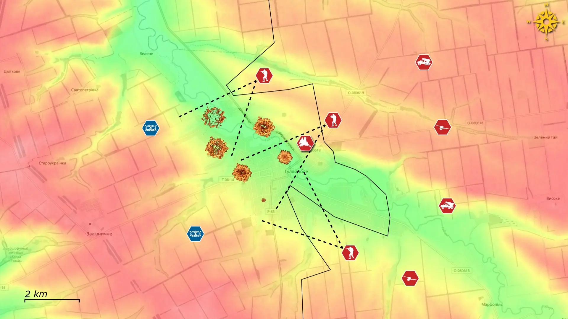 Betrachtet man die topografische Karte, erkennt man, dass unter anderem die Skala-Drohnenoperatoren Positionen auf dem Hochland westlich der Stadt halten, die einen Blick auf die Stadt im Tiefland bieten und hervorragende Beobachtungs- und Signalpositionen darstellen.
