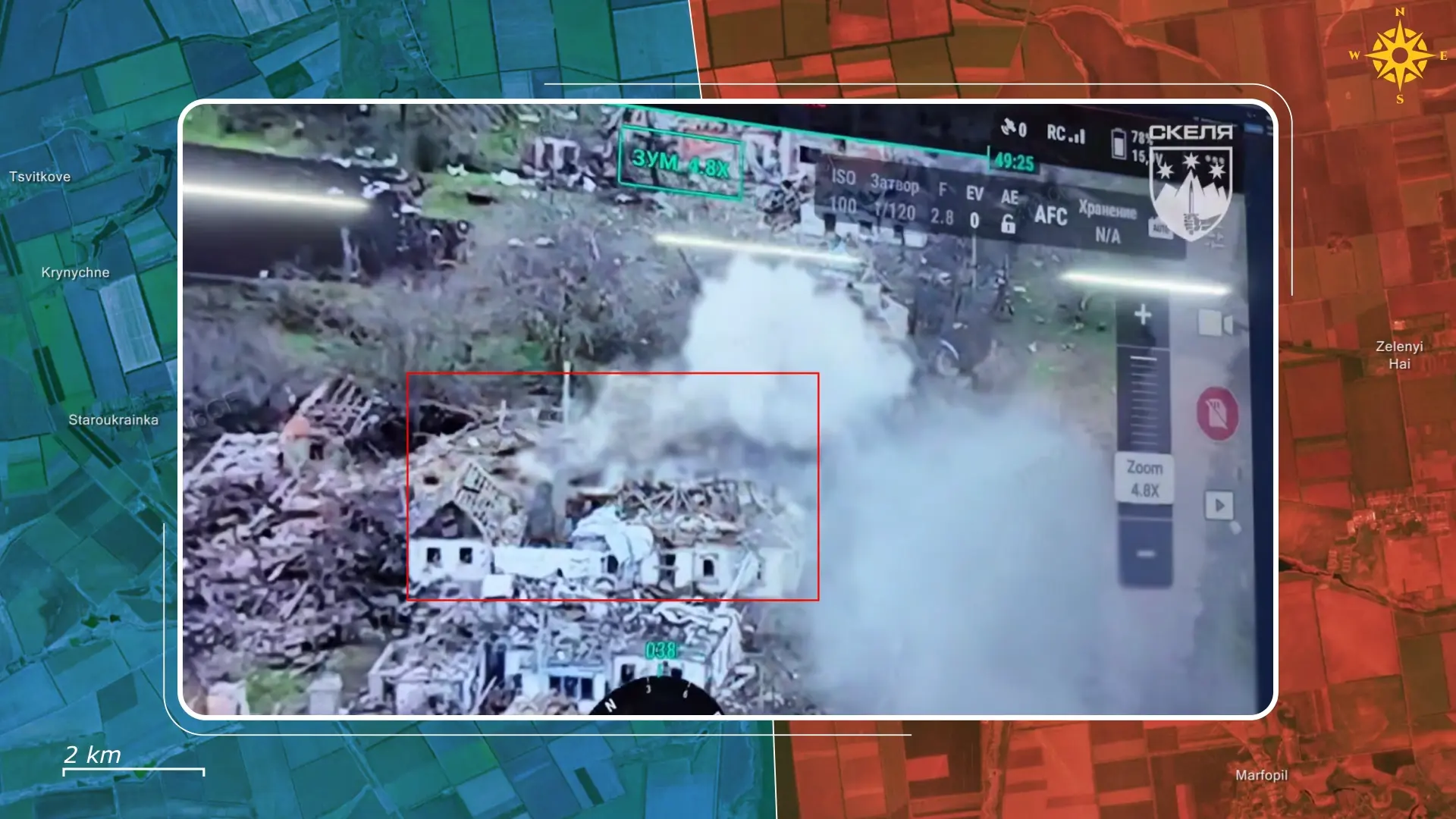 Nach dem Bombenabwurf rückten die ukrainischen Soldaten schnell vor, um die Struktur zu räumen und die desorganisierten und desorientierten Russen innerhalb von Sekunden auszuschalten. Die schnellen Aktionen ermöglichten es den Skala-Soldaten, sich ohne Verluste in nahegelegene sichere Positionen zurückzuziehen, noch bevor ein russischer Artilleriebeschuss eingeleitet werden konnte.