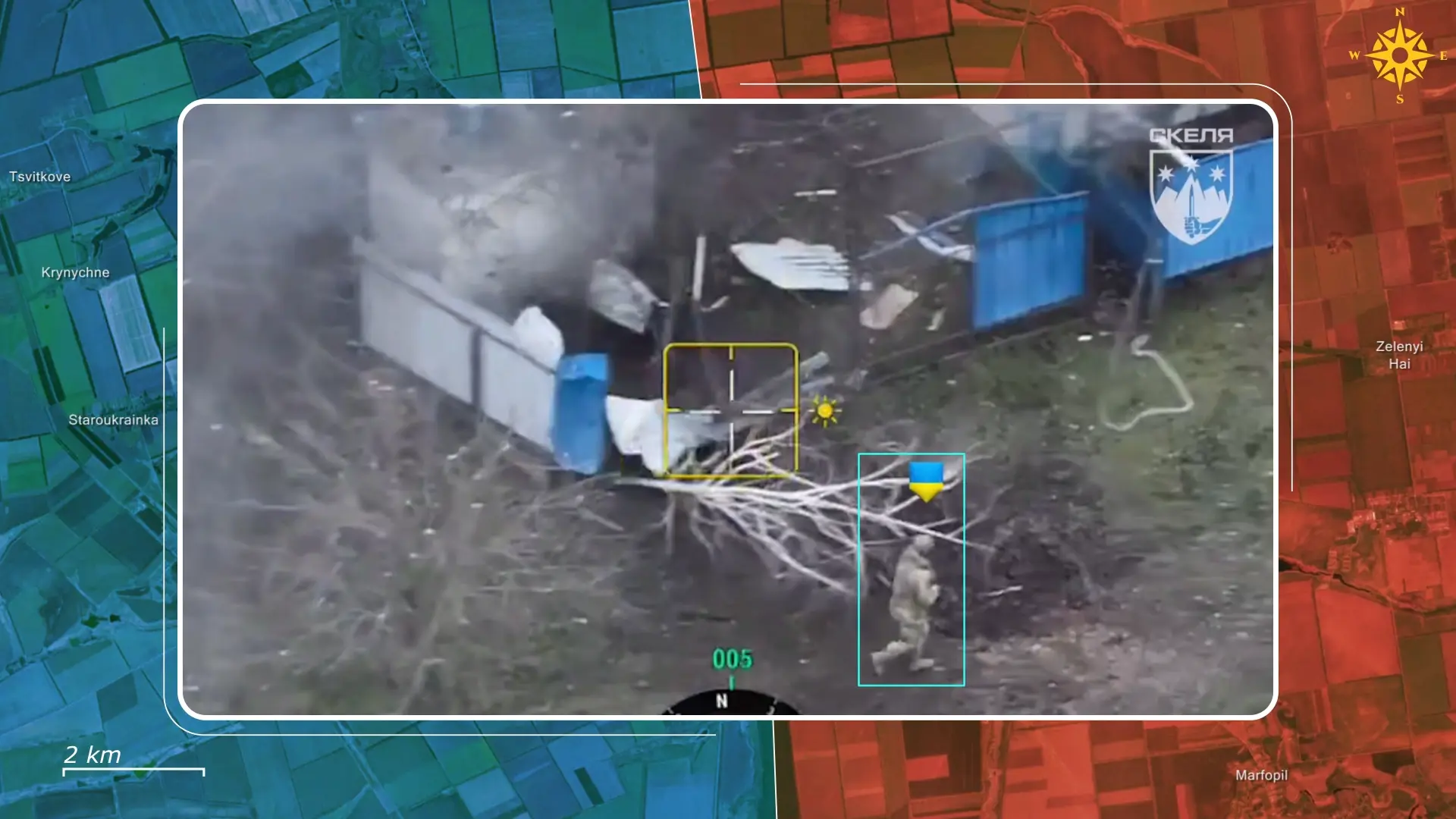 Geolokalisierte Aufnahmen zeigen, wie eine Operation des Skala-Regiments ablief. Zunächst entdeckten ihre Kommandeure mithilfe einer ukrainischen Aufklärungsdrohne zwei russische Soldaten im Freien und übermittelten die Informationen an nahe Drohnenoperatoren.
