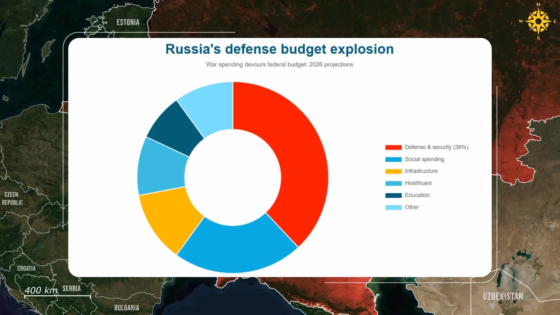Analysten weisen zunehmend darauf hin, dass sich der Staatshaushalt der Erschöpfung nähert, nicht weil Russland absolut gesehen an Ressourcen mangelt, sondern weil die Ausgabenstruktur untragbar geworden ist. Fast 40 Prozent der Ausgaben sind an den Krieg gebunden, was kaum Spielraum lässt, um Schocks abzufedern oder sich an ungünstige Bedingungen anzupassen.