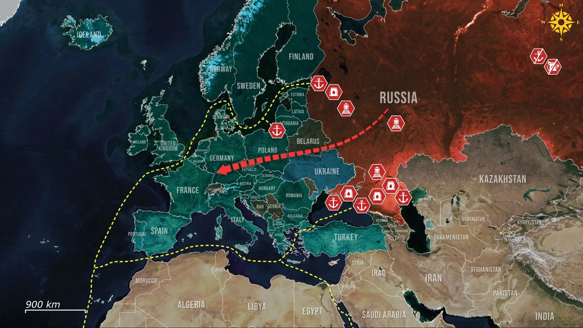 Die geografische Lage verschärft das Problem. Fast die gesamte russische Exportkapazität ist an das europäische Russland gebunden, nicht an den Pazifik. Pipeline-Netze, Lagertanks, Mischanlagen, Eisenbahnverbindungen und Flussrouten wurden historisch für Europa gebaut, wodurch die Flüsse zu den baltischen und schwarzen Seehäfen konzentriert wurden. Gleichzeitig fehlen den fernöstlichen Häfen vergleichbare Infrastruktur und Tankerumschlagskapazität, sodass Störungen in europäischen Gewässern die Exportvolumina schnell lahmlegen.