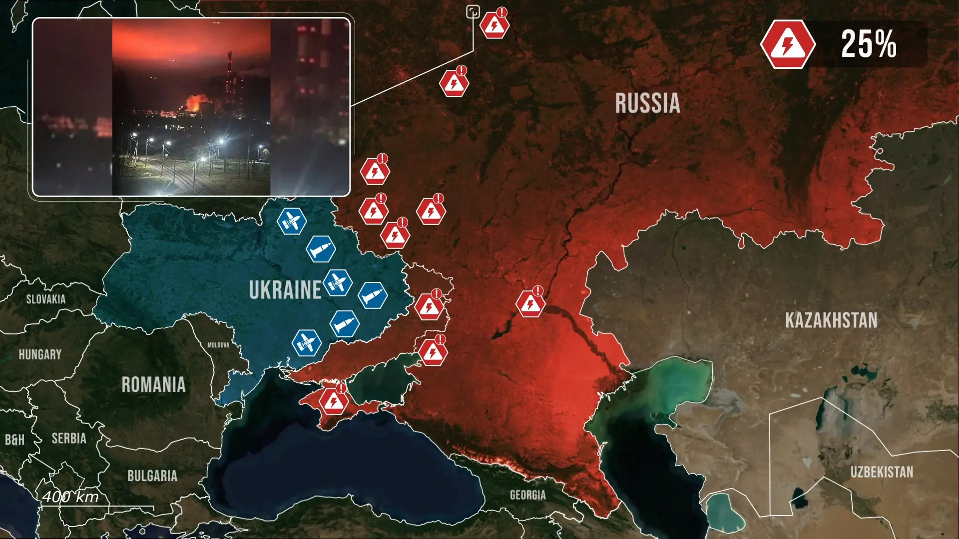 In Belgorod führte ein Angriff auf das Wärmekraftwerk Lutsch dazu, dass 20.000 Einwohner ohne Strom blieben, wodurch die Stadt in Dunkelheit versank. In Wladimir wurde die gewaltige 750-kV-Umspannstation Wladimirskaja erneut getroffen – nur wenige Wochen nach Reparaturen –, was zeigt, dass die Ukraine hochspannungsführende Knotenpunkte schneller außer Betrieb setzen kann, als Russland sie wiederherstellen kann.