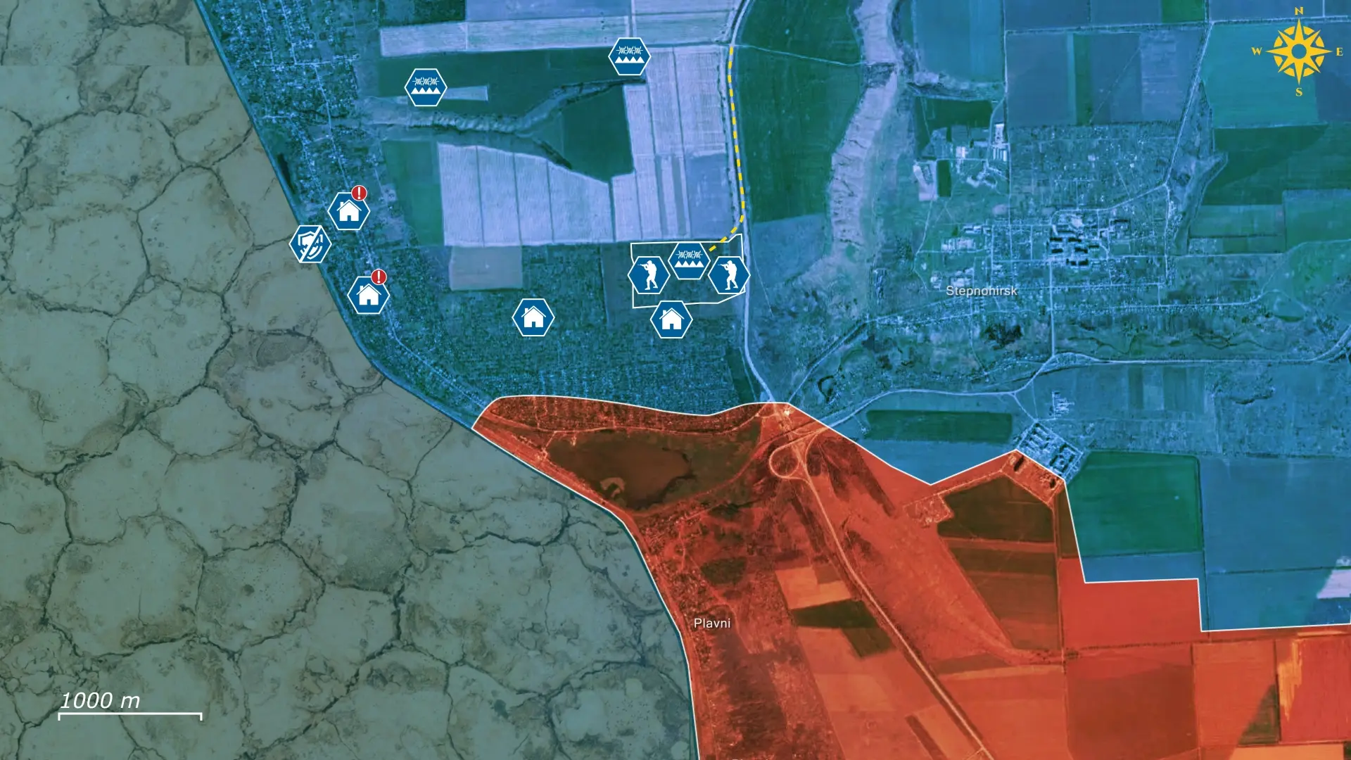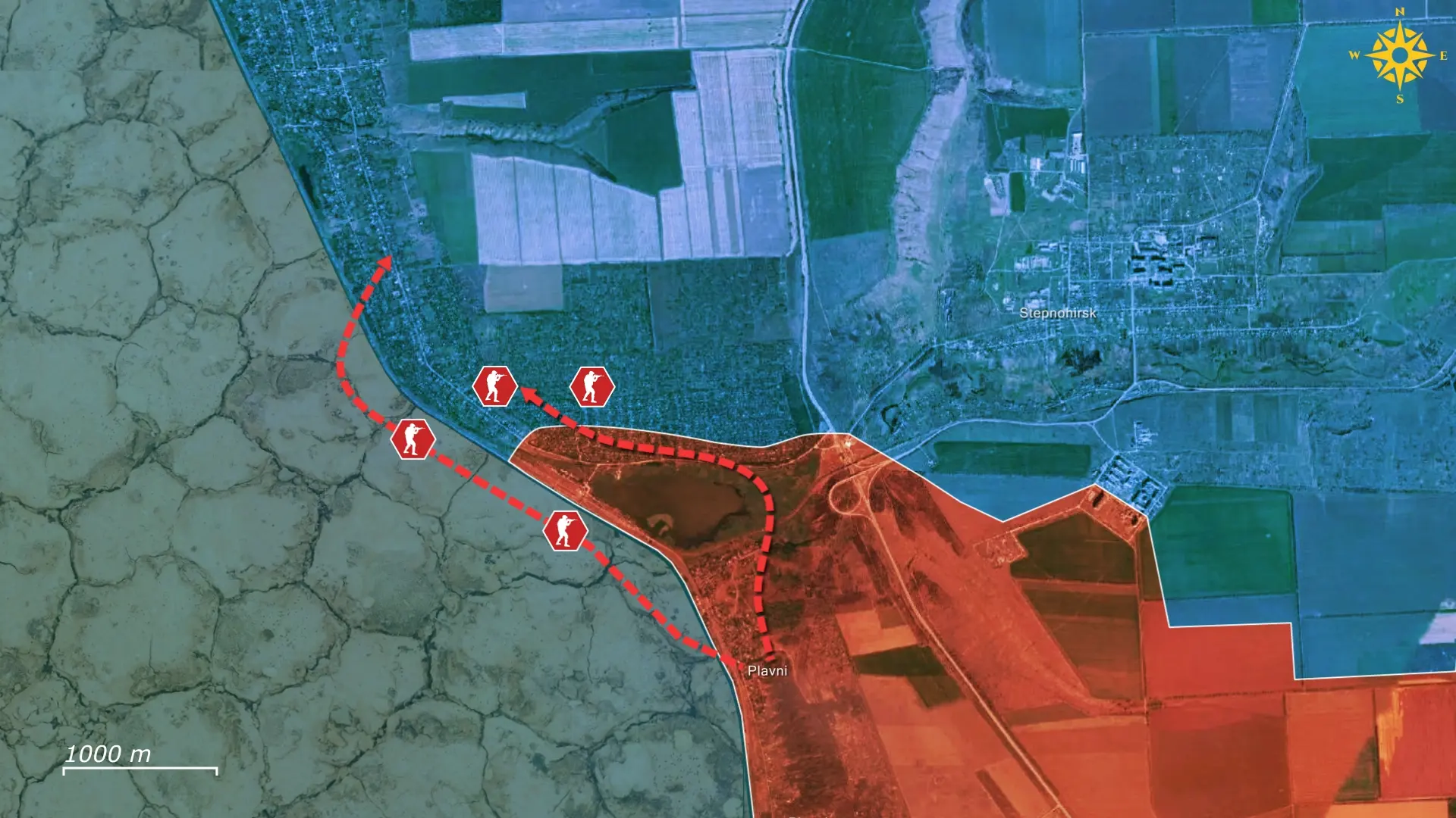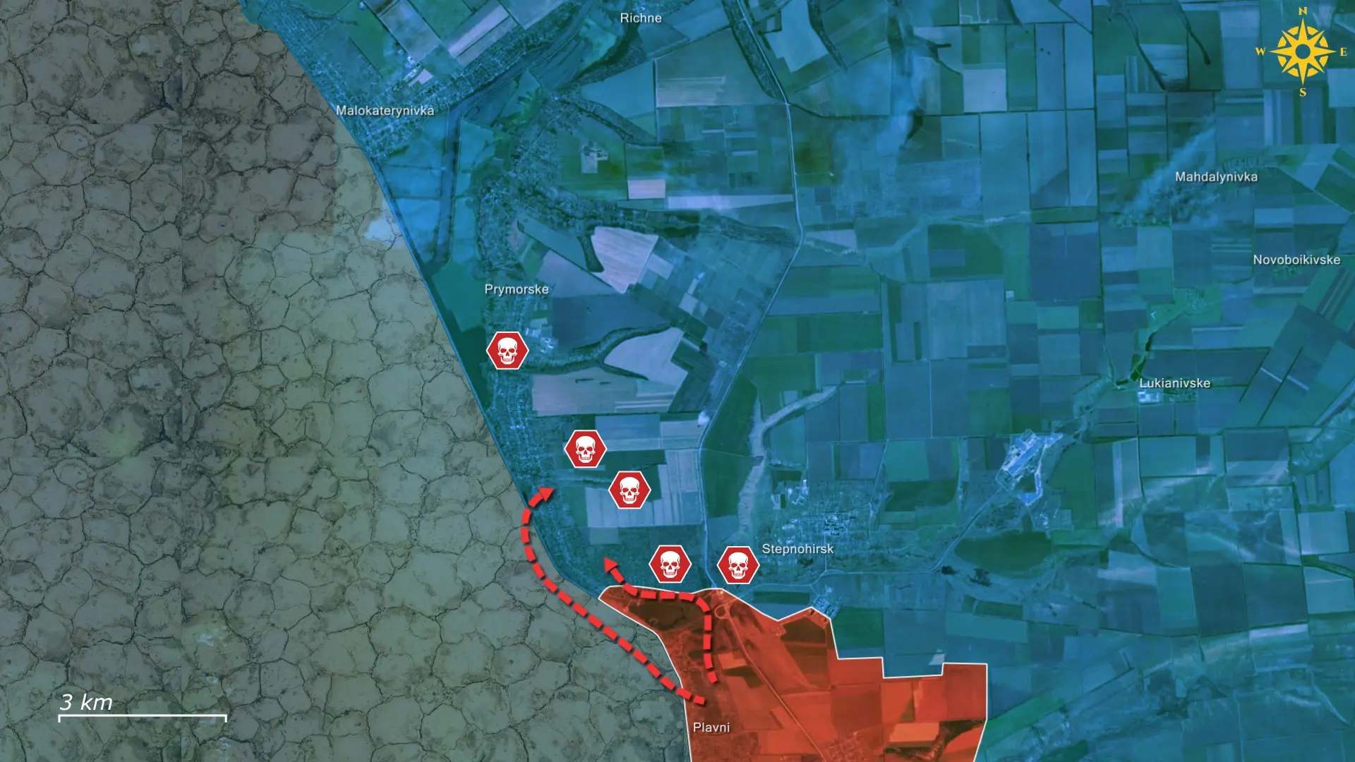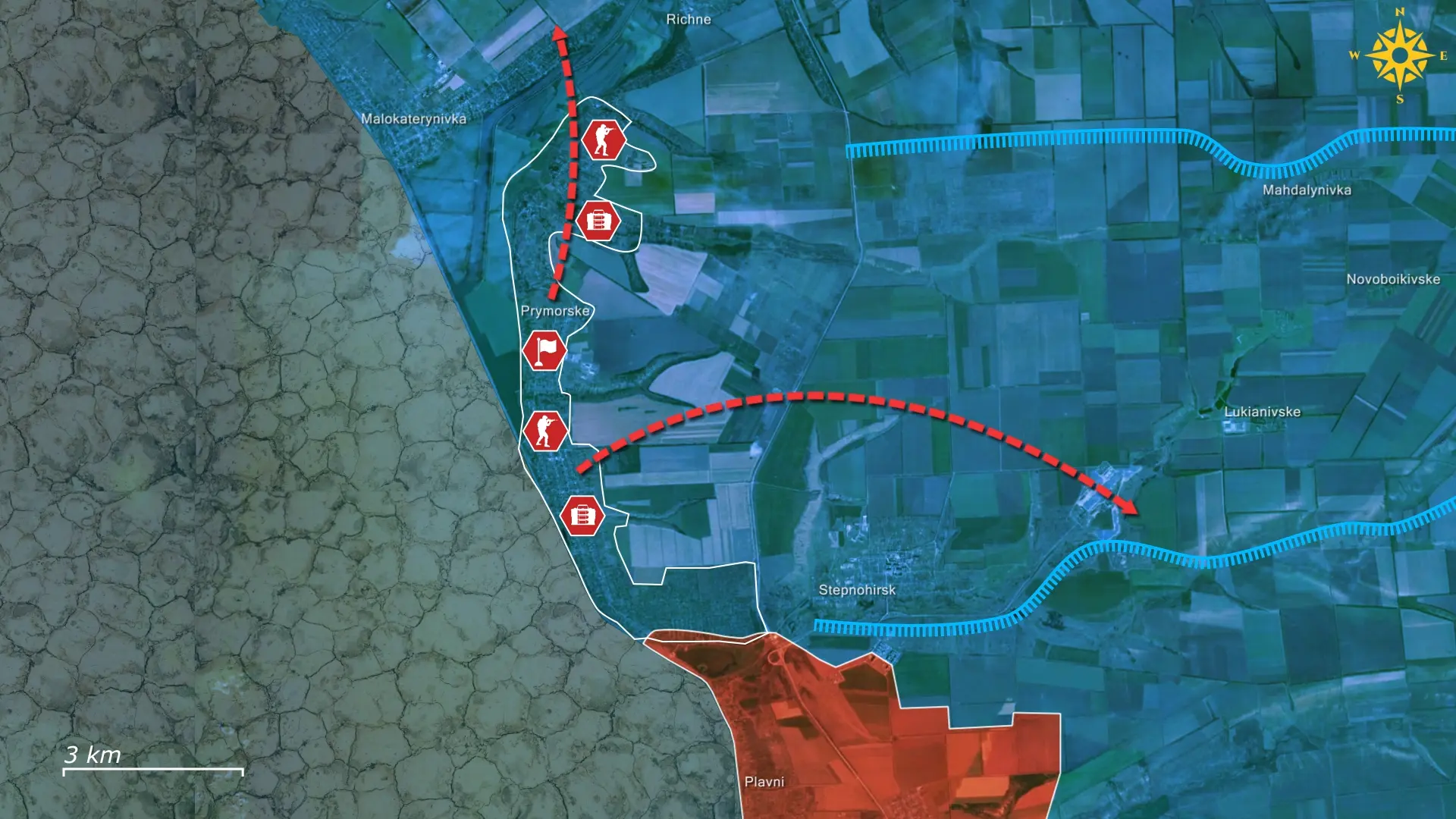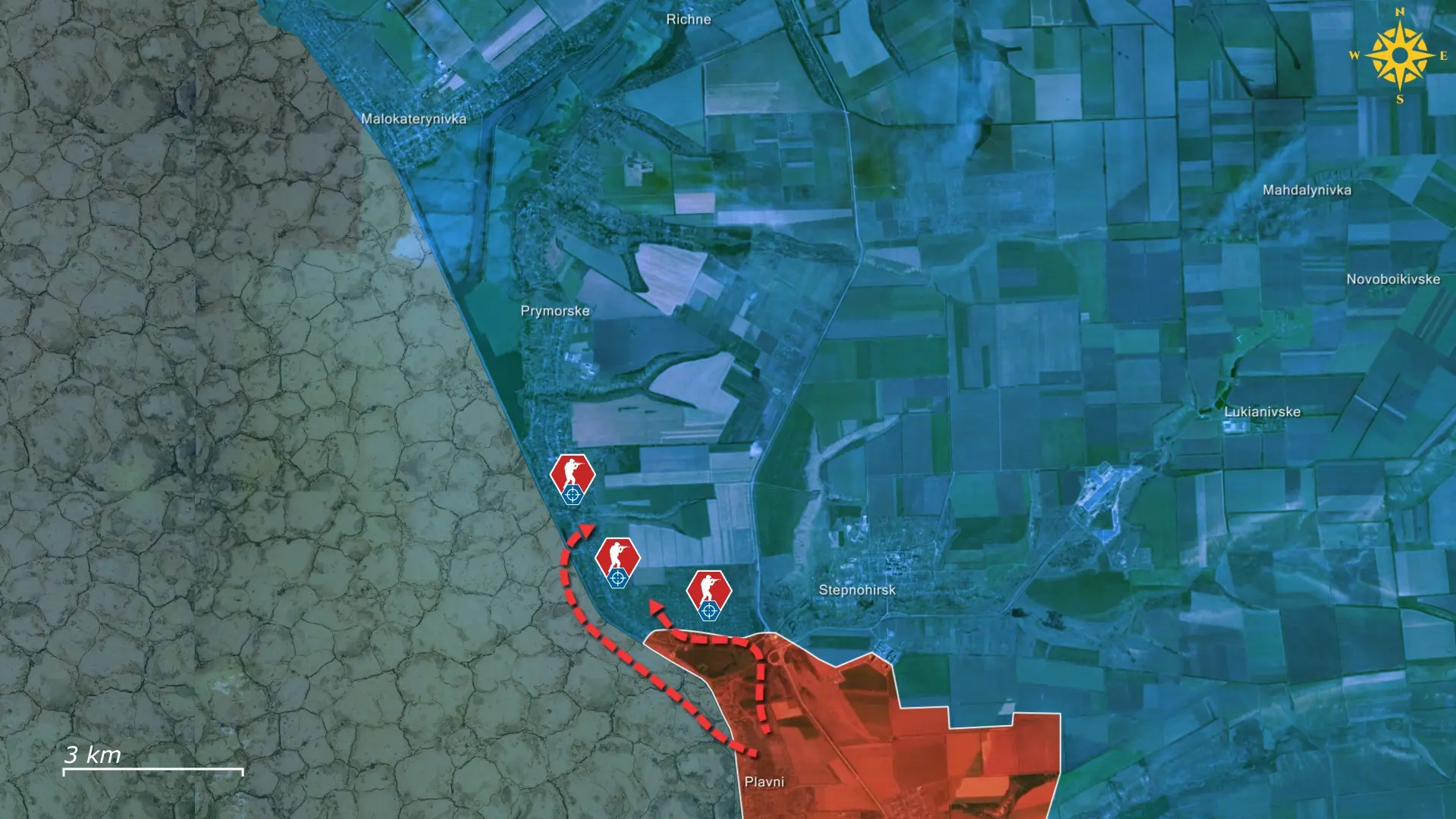 Para lograrlo, las fuerzas rusas están empleando sus características tácticas de infiltración, intentando activamente entrar en el pueblo desde Plavni y penetrar en el sector central de Prymorske desplazándose por el fondo del embalse de Kajovka. Su segundo eje de ataque atraviesa el lecho seco del propio río Dniéper, lo que permite un intento de infiltración en el asentamiento desde el oeste y atacar a los defensores desde una dirección para la que están menos preparados. Con el embalse ahora casi completamente desecado tras la destrucción de la presa de Nova Kajovka, las fuerzas rusas pueden finalmente avanzar sobre él, creando las condiciones para un asalto más audaz y potencialmente más disruptivo.