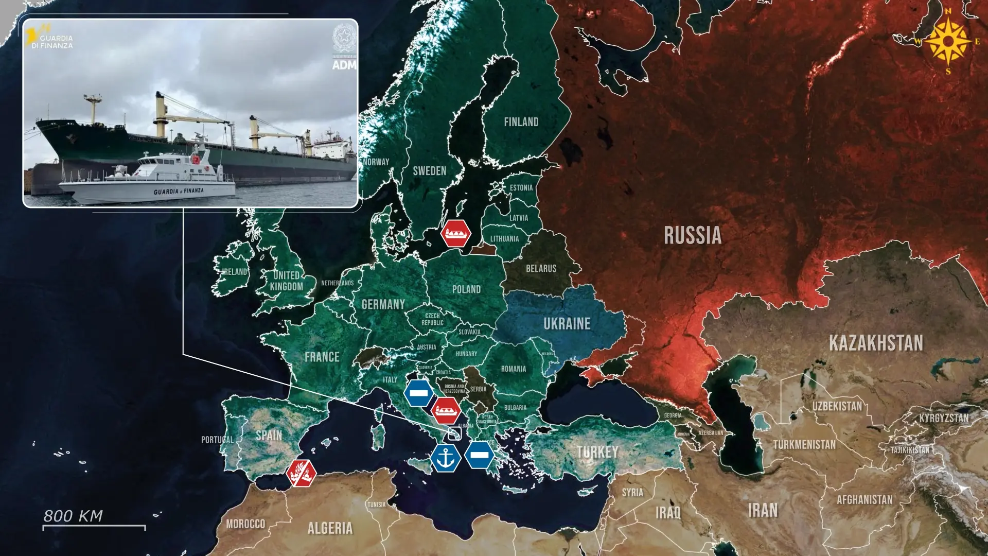 L’application s’est ensuite étendue des eaux ouvertes aux infrastructures portuaires, avec les autorités italiennes détenant un navire cargo transportant des marchandises liées au commerce russe, bloquant son départ et initiant des inspections qui ont maintenu le navire sur place. Avec le navire retenu au port, le mouvement des cargaisons a cessé, les équipages ont été contraints de rester à bord, et le navire a été saisi sous juridiction italienne pendant que la documentation et la conformité étaient examinées. La détention ne reposait pas sur des avertissements ou des sanctions futures, mais sur le contrôle physique immédiat du navire et sa capacité à naviguer.