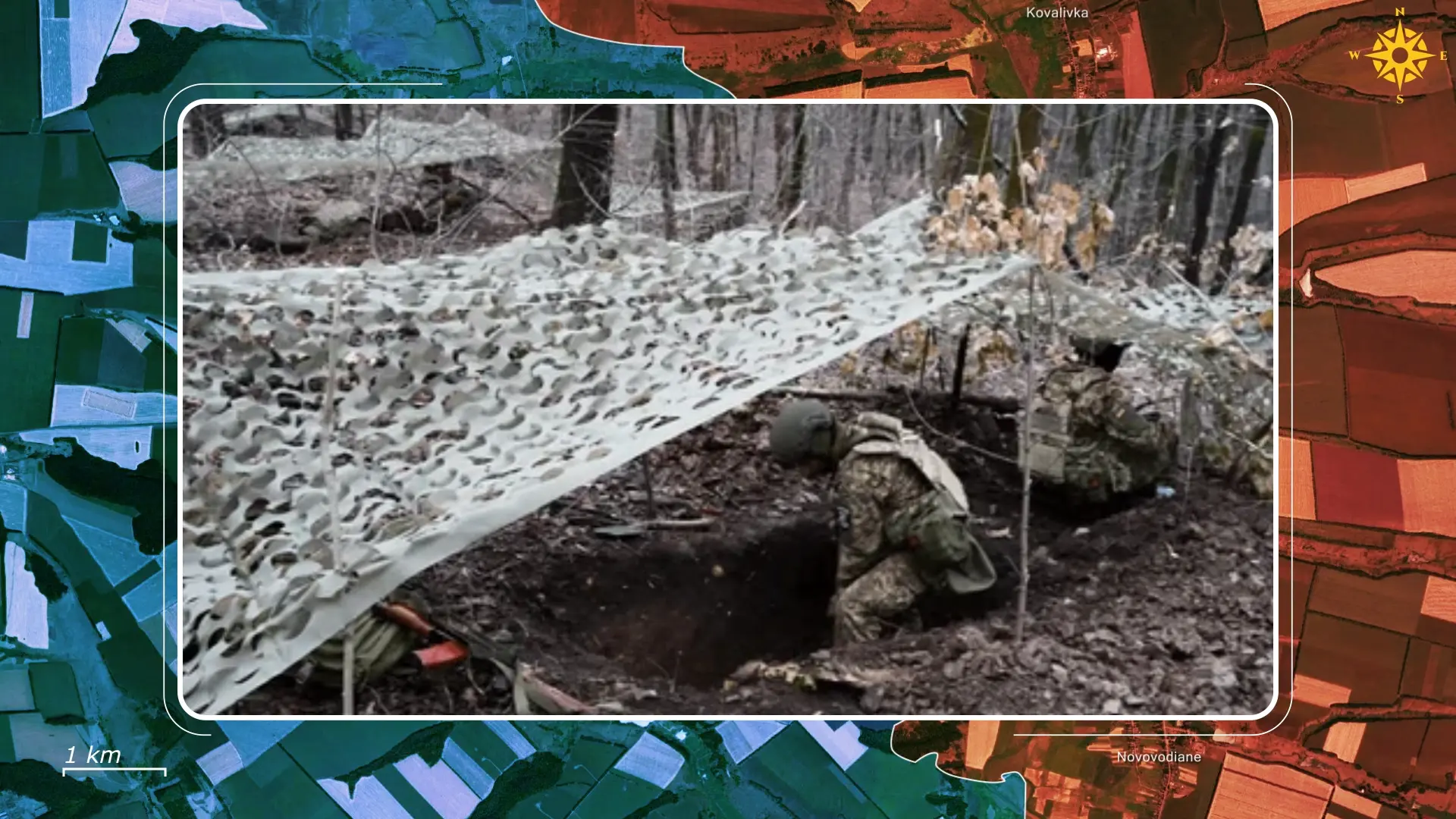 Les sections de tranchées utilisées activement sont couvertes de couches de bois, de rondins et de terre tassée pour neutraliser les munitions larguées par drones et réduire l’efficacité des FPV. Les toitures sont renforcées avec des sacs de sable ou des matériaux de récupération pour augmenter la masse tout en restant réparables. Le camouflage est adapté au terrain et à la saison, utilisant des filets verts et bruns dans les zones forestières, des couvertures plus claires lors des chutes de neige, et des motifs irréguliers pour tromper les systèmes de détection par contraste et l’œil humain.
