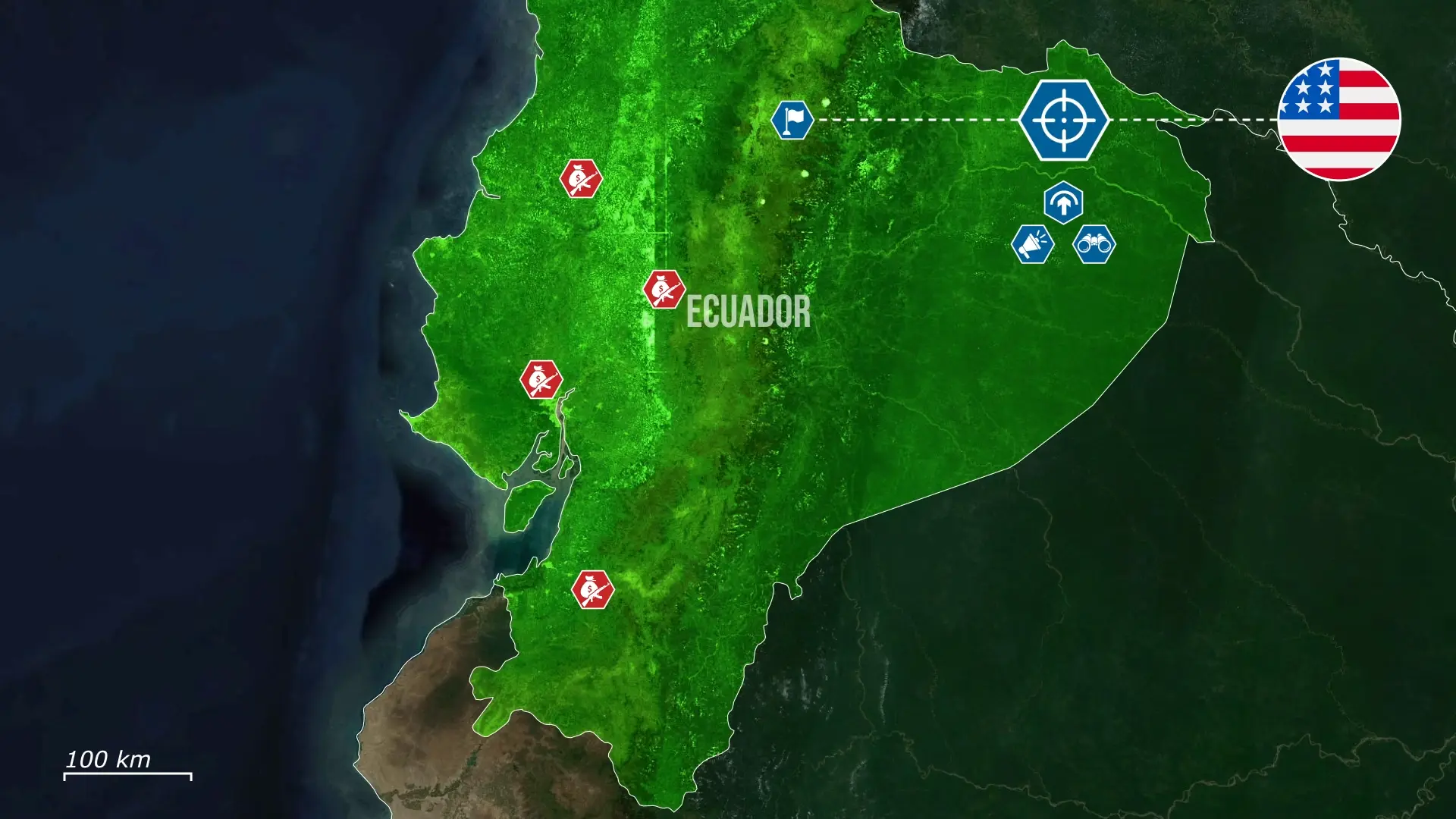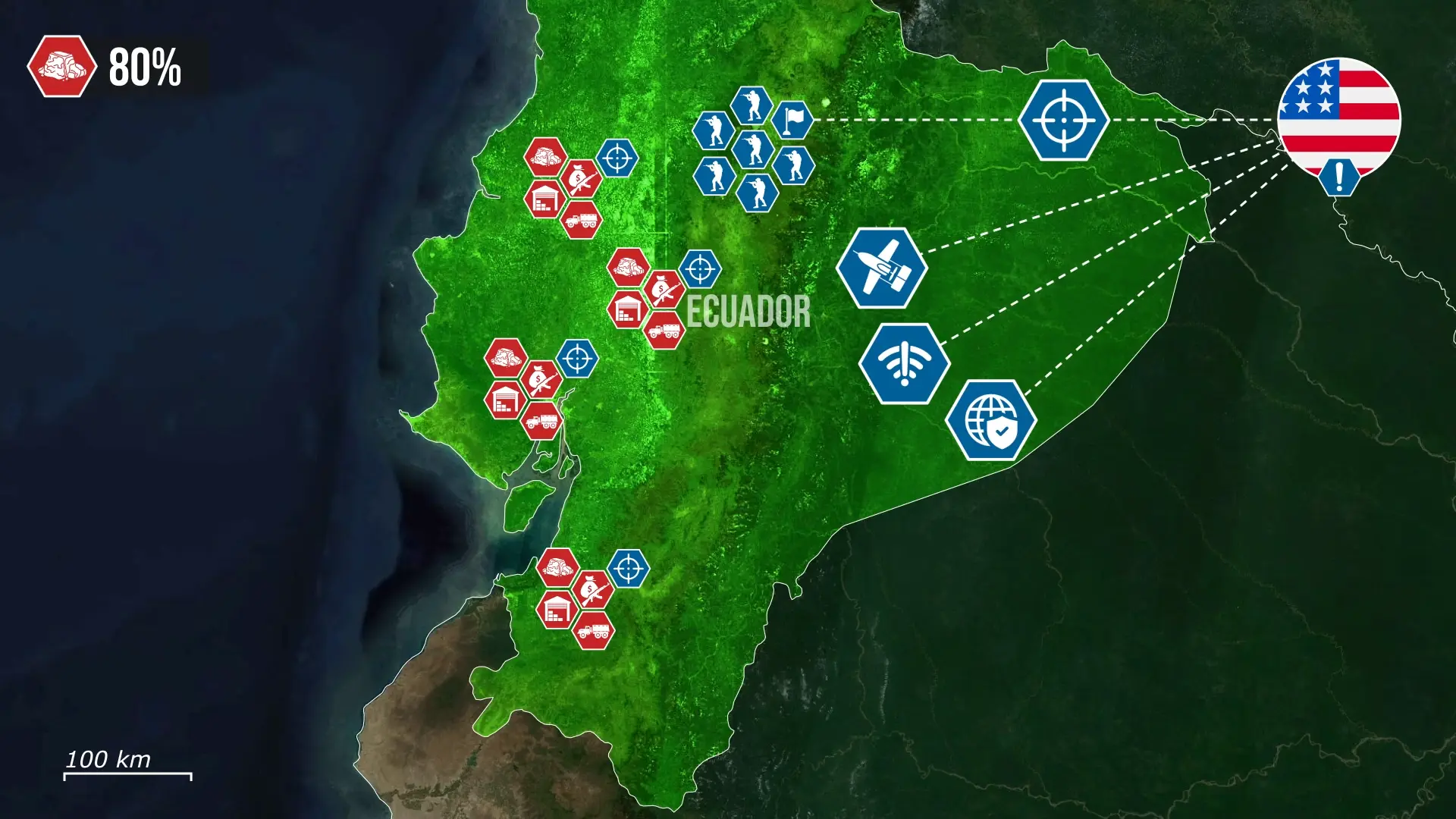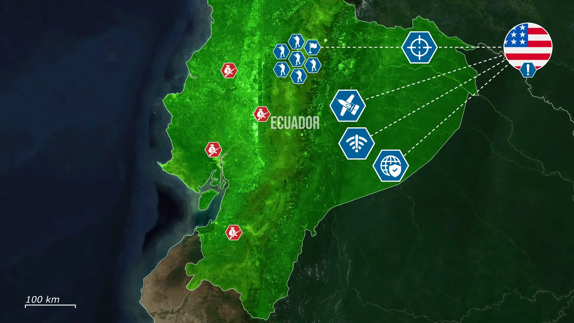 L'Équateur a déployé environ 10 000 soldats, tandis que les États-Unis fournissent du renseignement, des moyens de guerre électronique et un appui aérien. Bien que les États-Unis affirment que leur personnel ne participe pas directement aux combats, l'ampleur de leur implication dans cette région est sans précédent.