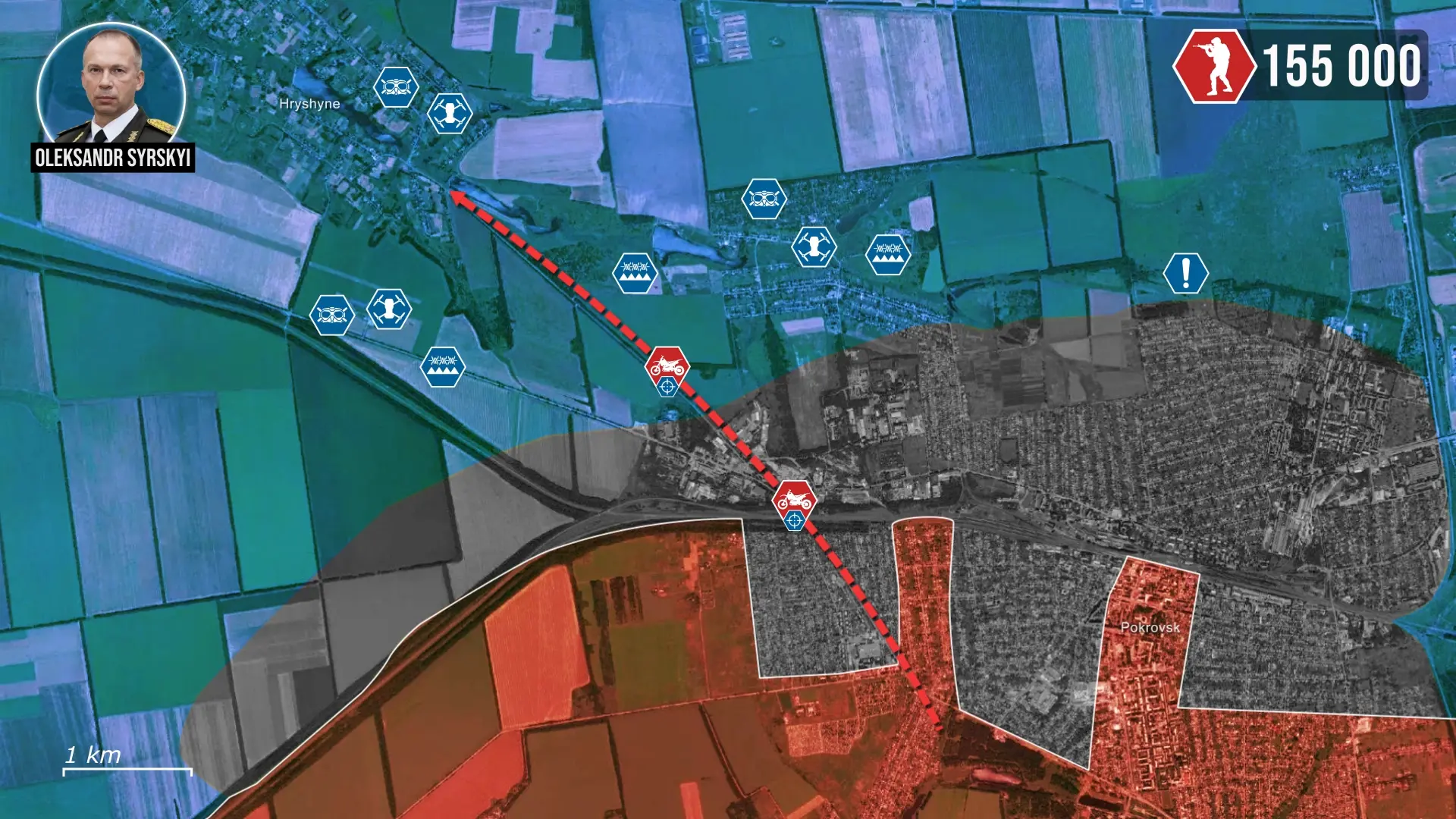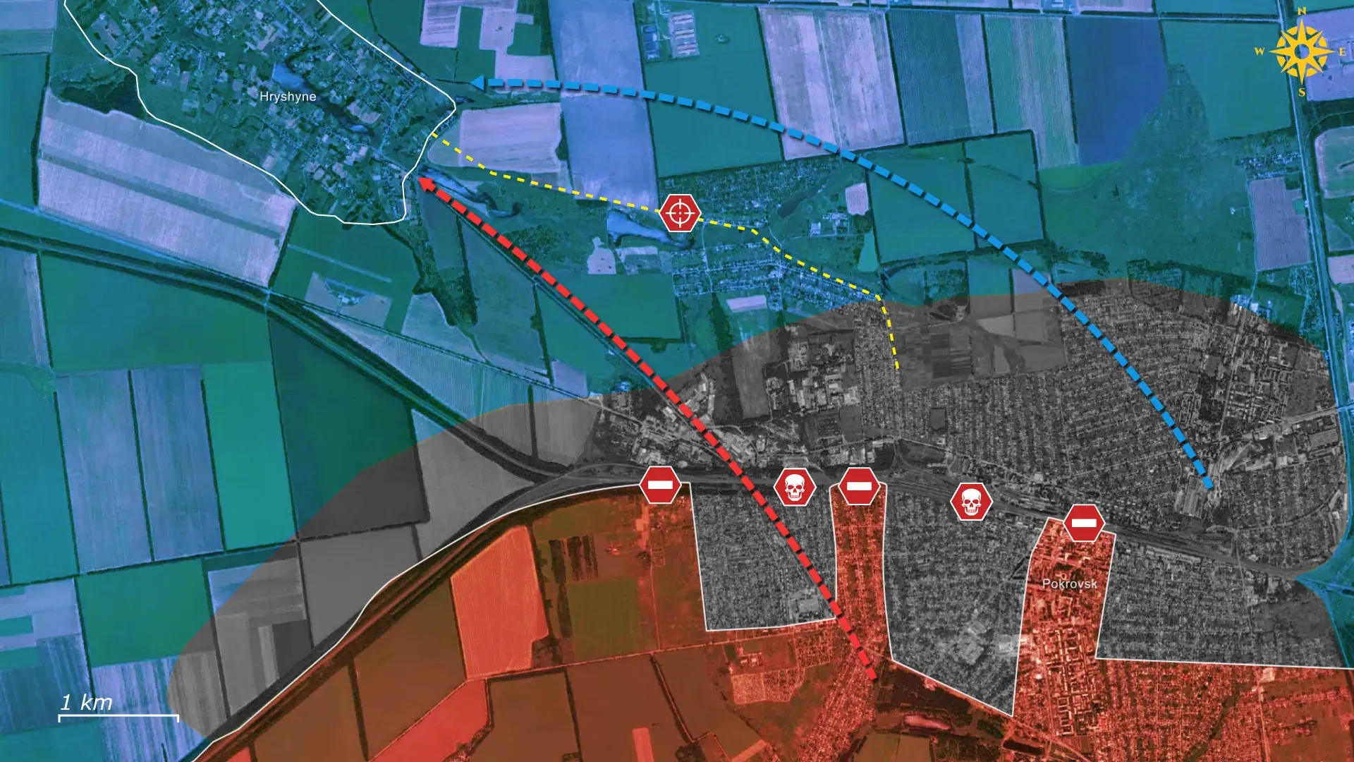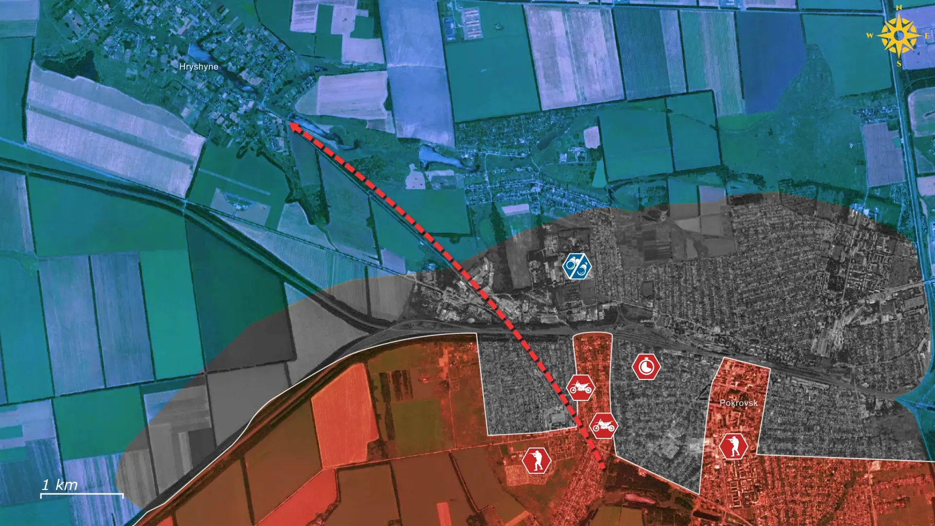 Les Ukrainiens ont réussi à empêcher les percées ennemies au nord de la voie ferrée, de sorte que les Russes veulent attaquer le flanc ouest et progresser vers Hryshyne. L’objectif russe est d’isoler le nord de Pokrovsk et de mettre en danger ses voies d’approvisionnement, intensifiant ainsi la pression. Une telle perturbation pourrait contraindre les forces ukrainiennes restantes à se replier, leurs positions devenant insoutenables dans une situation déjà difficile. En forçant un retrait ukrainien vers un terrain plus favorable, le commandement russe éviterait les assauts directs et les combats rapprochés de maison en maison qui infligeraient autrement des pertes substantielles à ses unités.