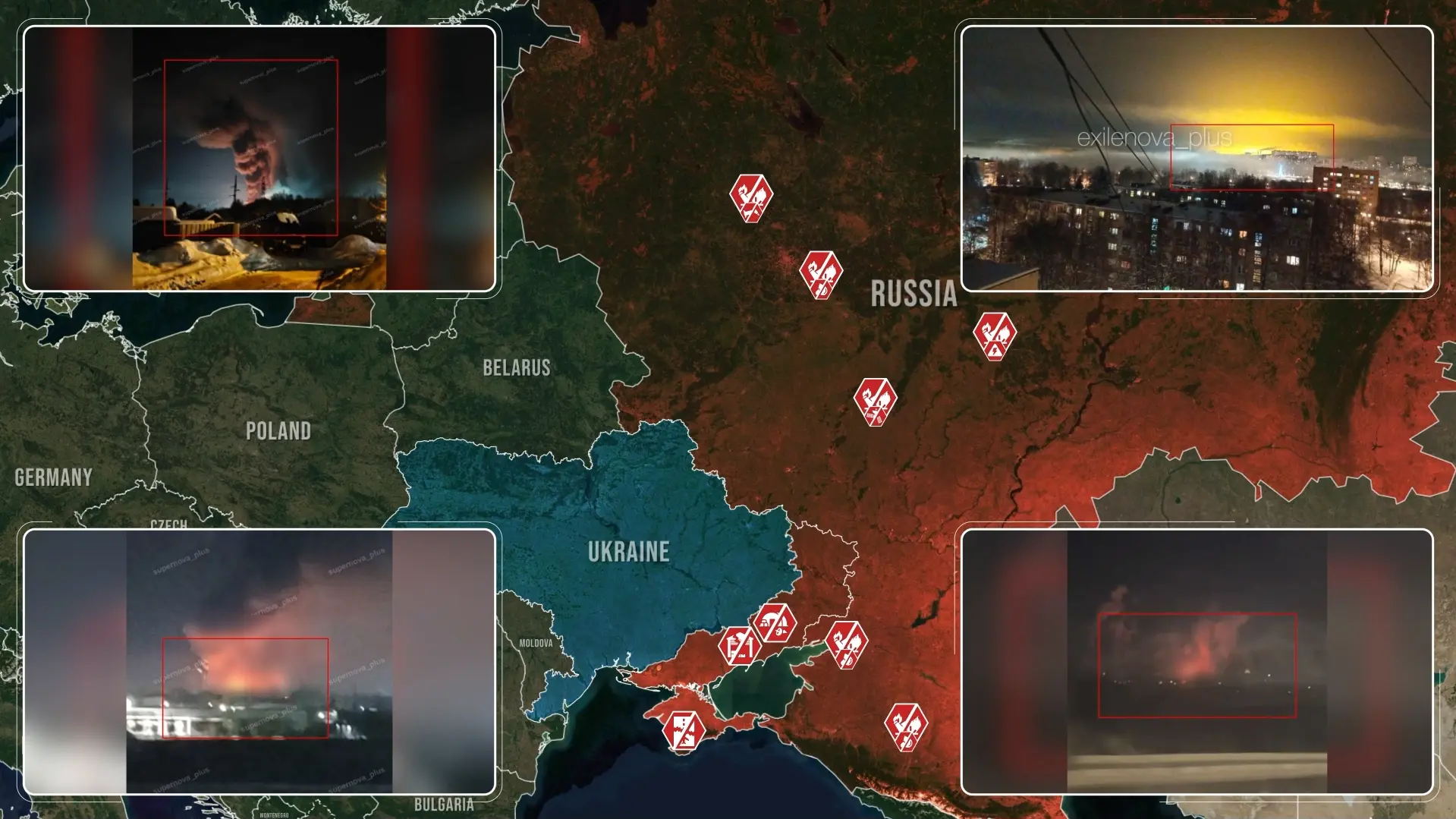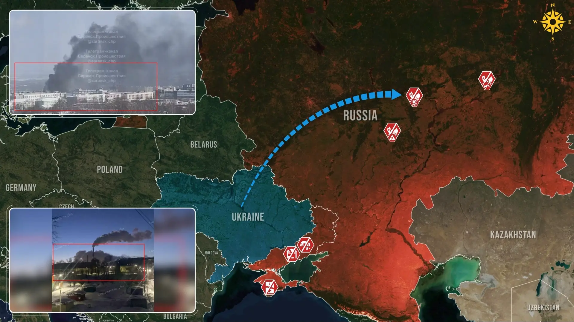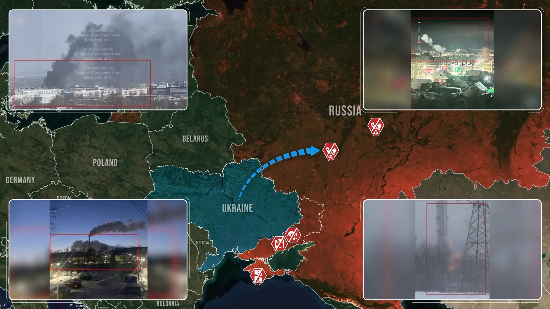 L'usine chimique Metafrax à Perm a pris feu après plusieurs explosions, perturbant la production d'explosifs pour missiles, tandis qu'à Mitchourinsk, l'usine Progress produisant des gyroscopes et des systèmes de navigation a été frappée à nouveau.