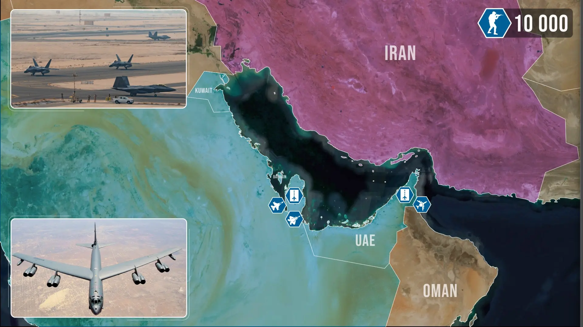 In Qatar, la base aerea di Al Udeid rappresenta la più grande installazione militare statunitense in Medio Oriente, con circa 10.000 effettivi, e ospita il comando avanzato del Comando Centrale. La base funge inoltre da snodo critico per il comando, il controllo, la logistica, l'intelligence e la proiezione della potenza aerea, supportando assetti quali i bombardieri B-52 Stratofortress e B-1 Lancer, oltre ai caccia F-35, F-22 e F-16.