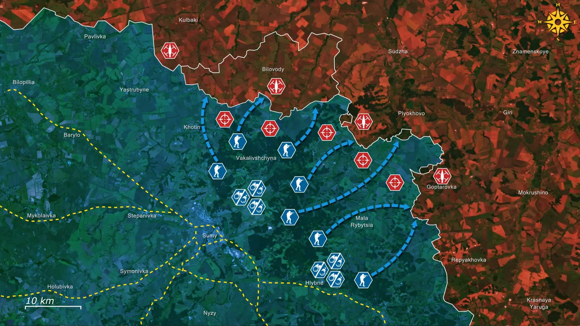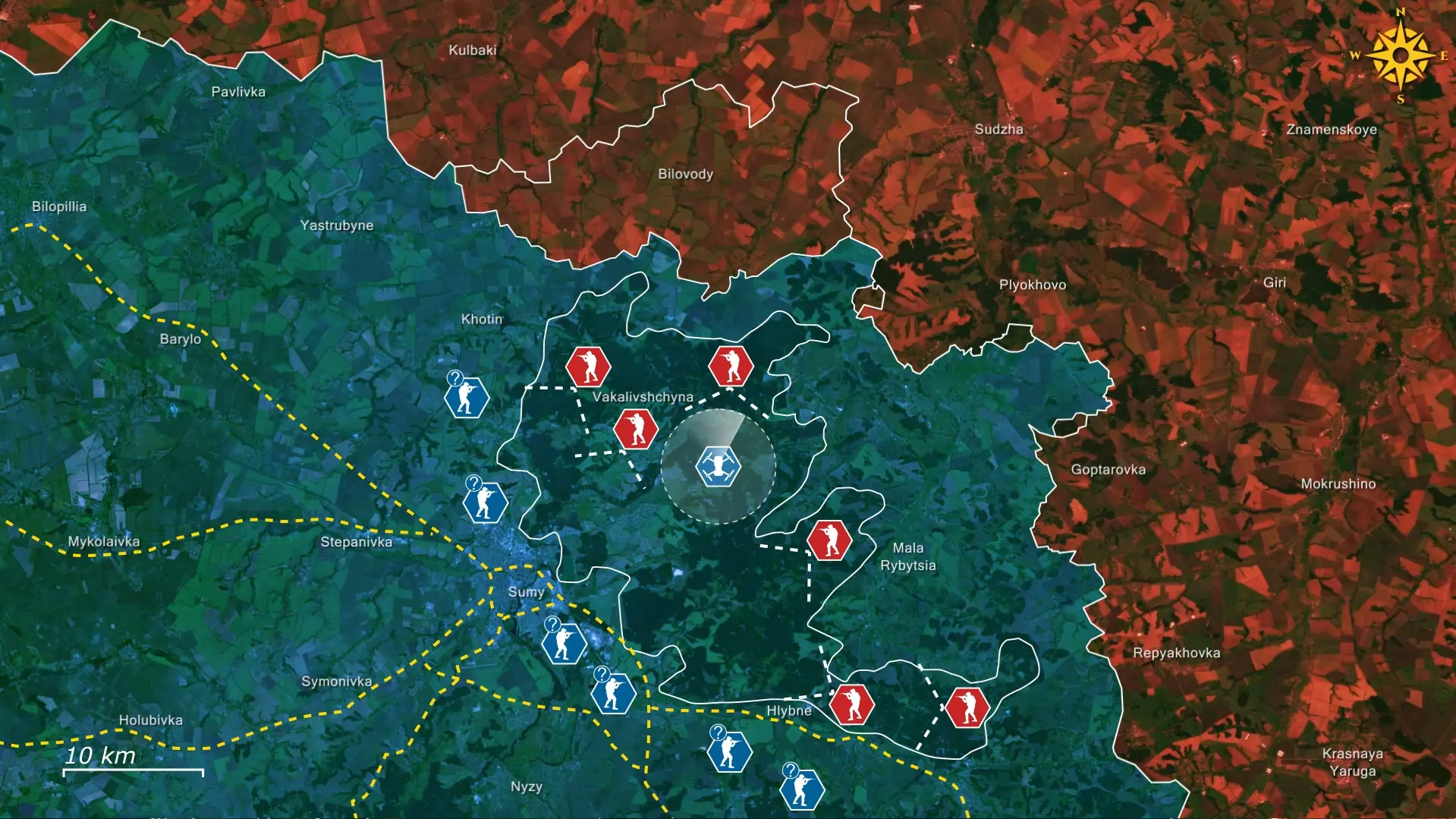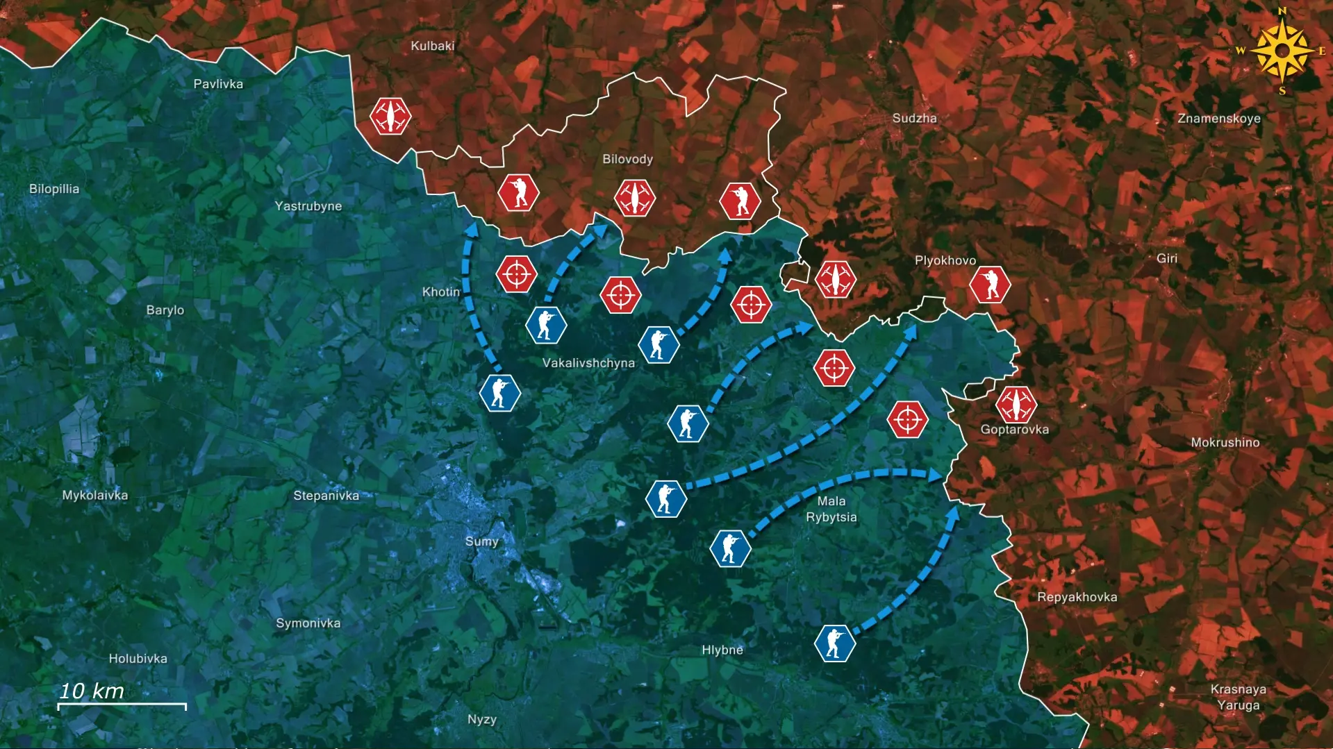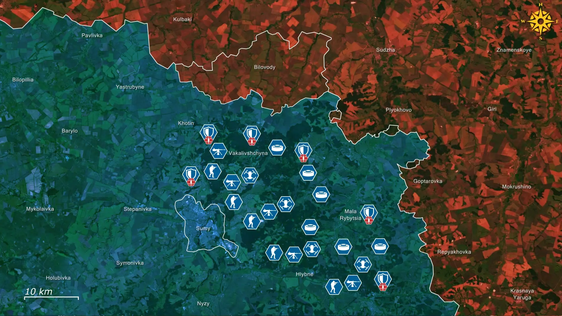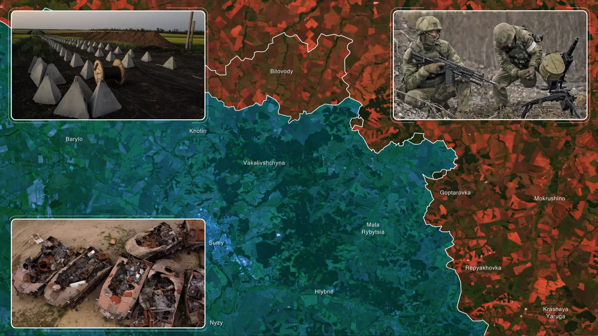 Sumy è stata individuata come obiettivo poiché le forze russe sono avanzate sufficientemente vicino nelle fasi iniziali da impedire all'Ucraina di costruire una linea difensiva pienamente sviluppata a ridosso della foresta. Le forze ucraine si sono affidate invece al controllo del fuoco da posizioni boschive occultate per fermare le incursioni russe, piuttosto che mantenere una linea fortificata con opere di ingegneria. Data la costante prossimità delle unità russe, ogni tentativo di costruire trincee, bunker o ostacoli nelle aree avanzate poteva essere rapidamente rilevato e colpito. I macchinari per il movimento terra e il suolo smosso generano firme termiche e visive chiare che i droni possono individuare facilmente, rendendo le attività di costruzione estremamente vulnerabili agli attacchi.
