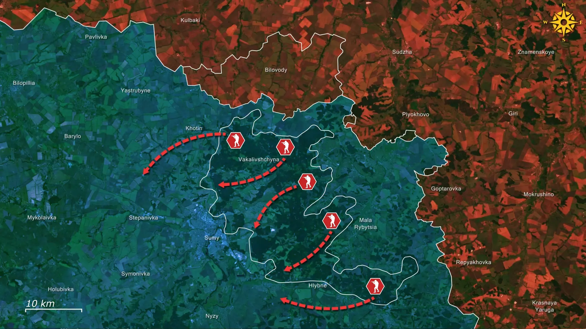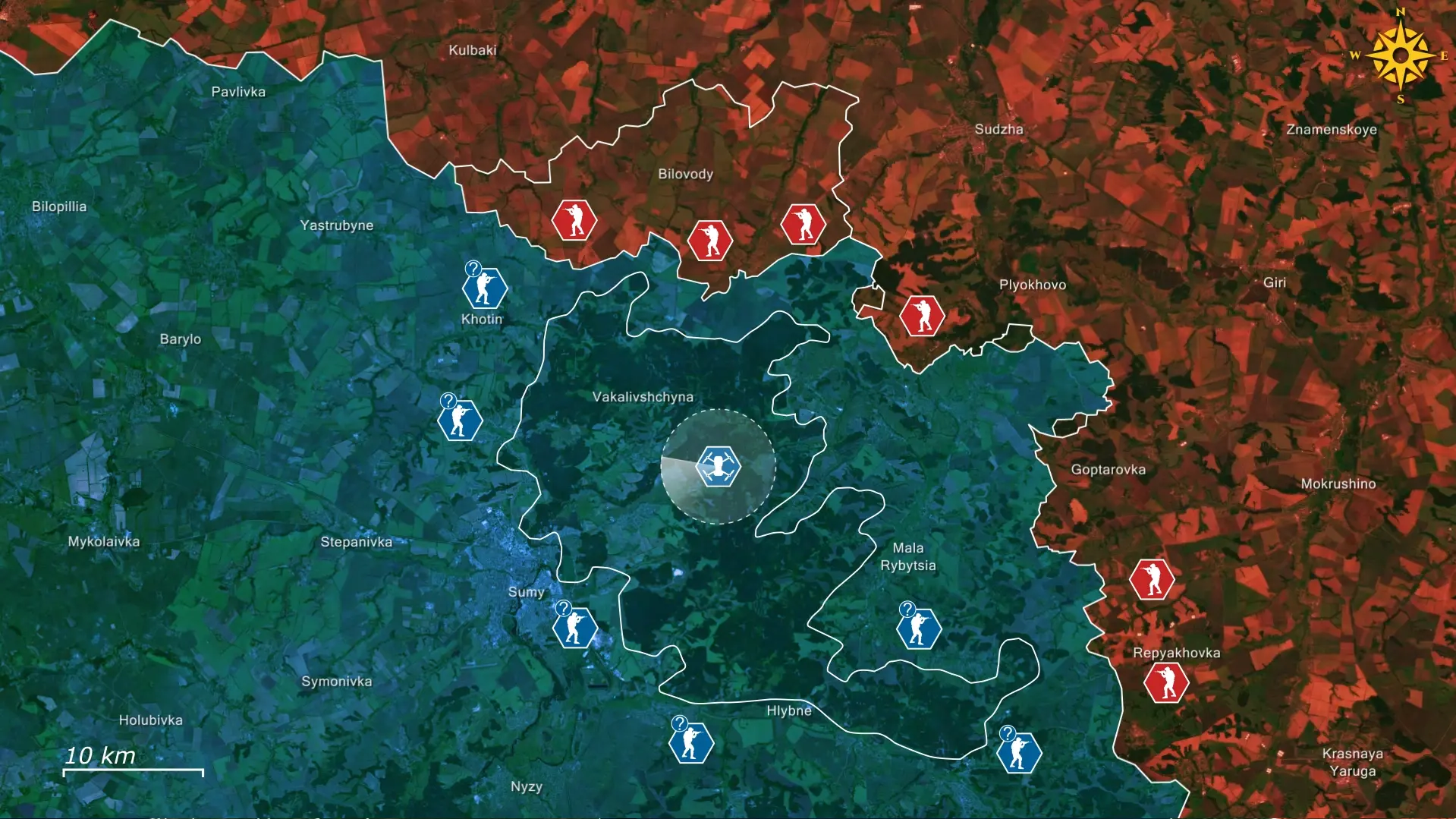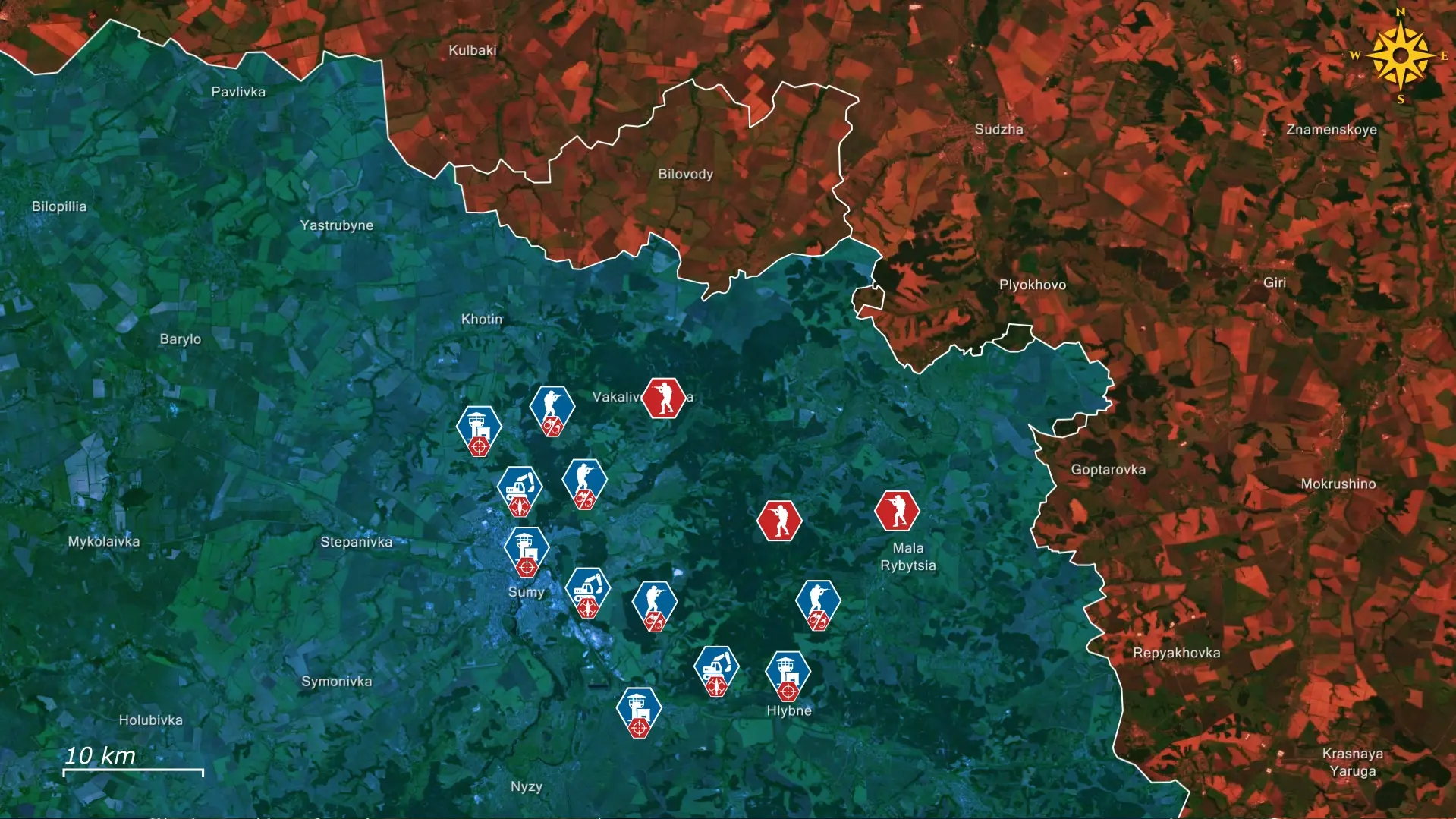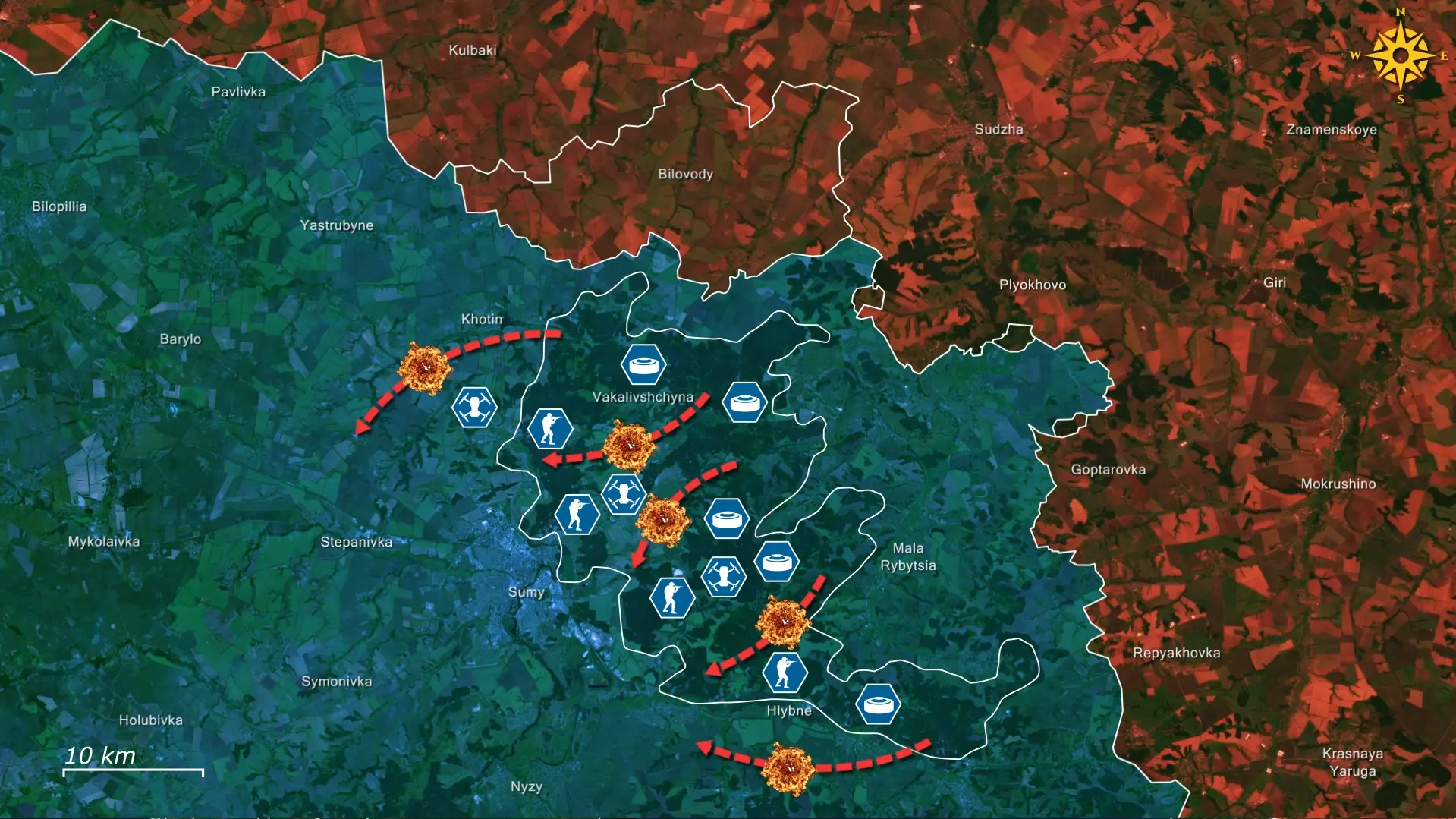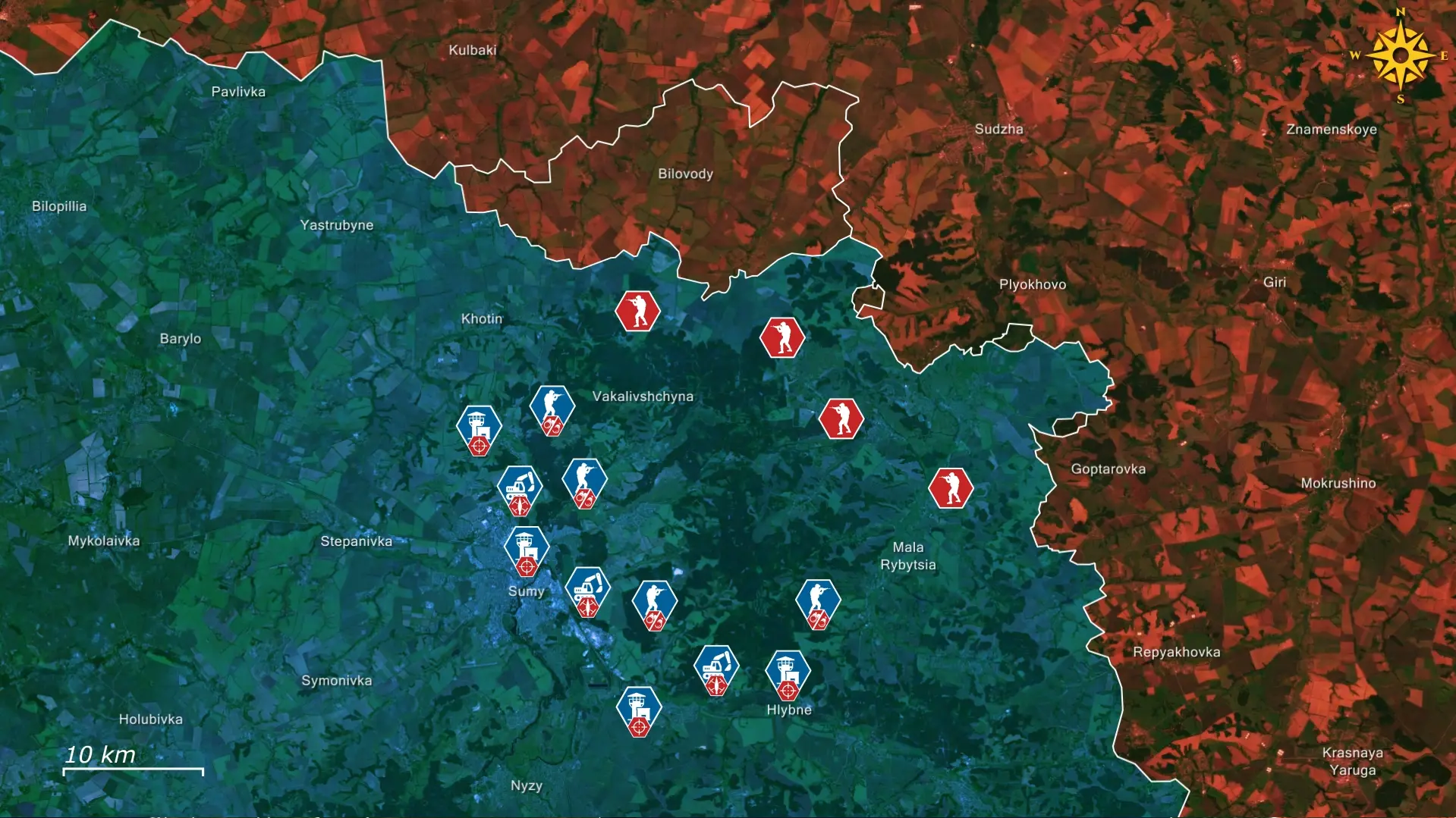 Sumy è stata individuata come obiettivo poiché le forze russe sono avanzate sufficientemente vicino nelle fasi iniziali da impedire all'Ucraina di costruire una linea difensiva pienamente sviluppata a ridosso della foresta. Le forze ucraine si sono affidate invece al controllo del fuoco da posizioni boschive occultate per fermare le incursioni russe, piuttosto che mantenere una linea fortificata con opere di ingegneria. Data la costante prossimità delle unità russe, ogni tentativo di costruire trincee, bunker o ostacoli nelle aree avanzate poteva essere rapidamente rilevato e colpito. I macchinari per il movimento terra e il suolo smosso generano firme termiche e visive chiare che i droni possono individuare facilmente, rendendo le attività di costruzione estremamente vulnerabili agli attacchi.
