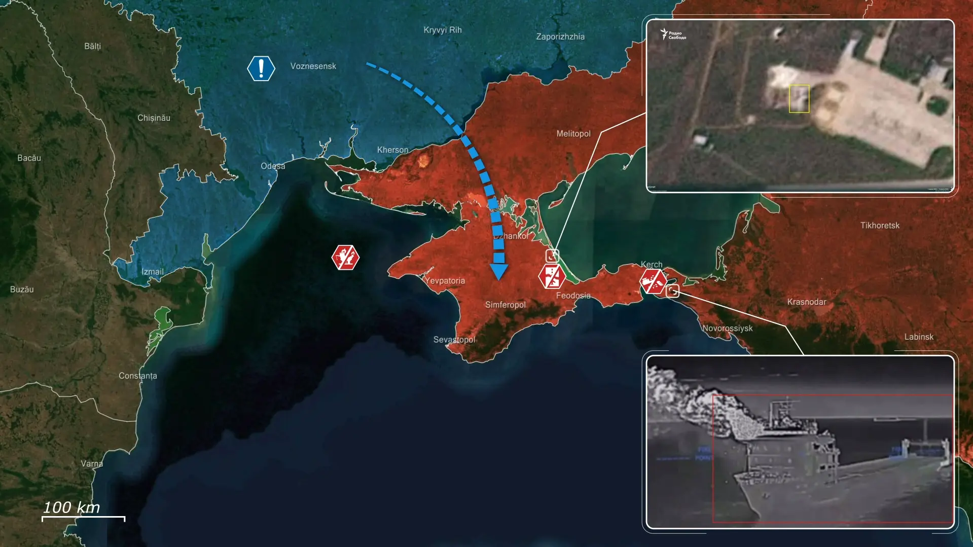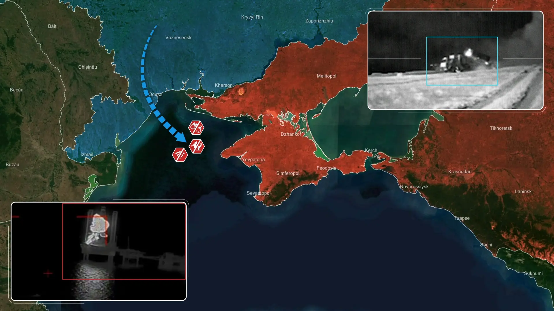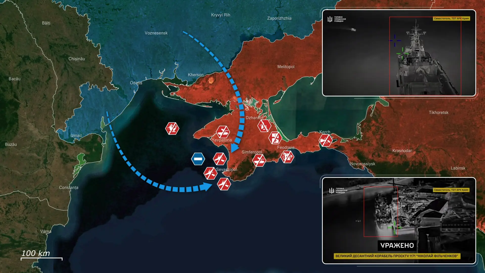 Tegelijkertijd vielen Oekraïense inlichtingeneenheden het logistieke netwerk van de Straat van Kertsj aan, waarbij de spoorwegveerboot Slavianin werd uitgeschakeld – de laatste operationele veerboot die door Russische troepen werd gebruikt om brandstof, munitie en materieel naar de Krim te transporteren, waardoor een van de laatste toevoerlijnen voor de Russische troepen op het schiereiland werd verbroken.