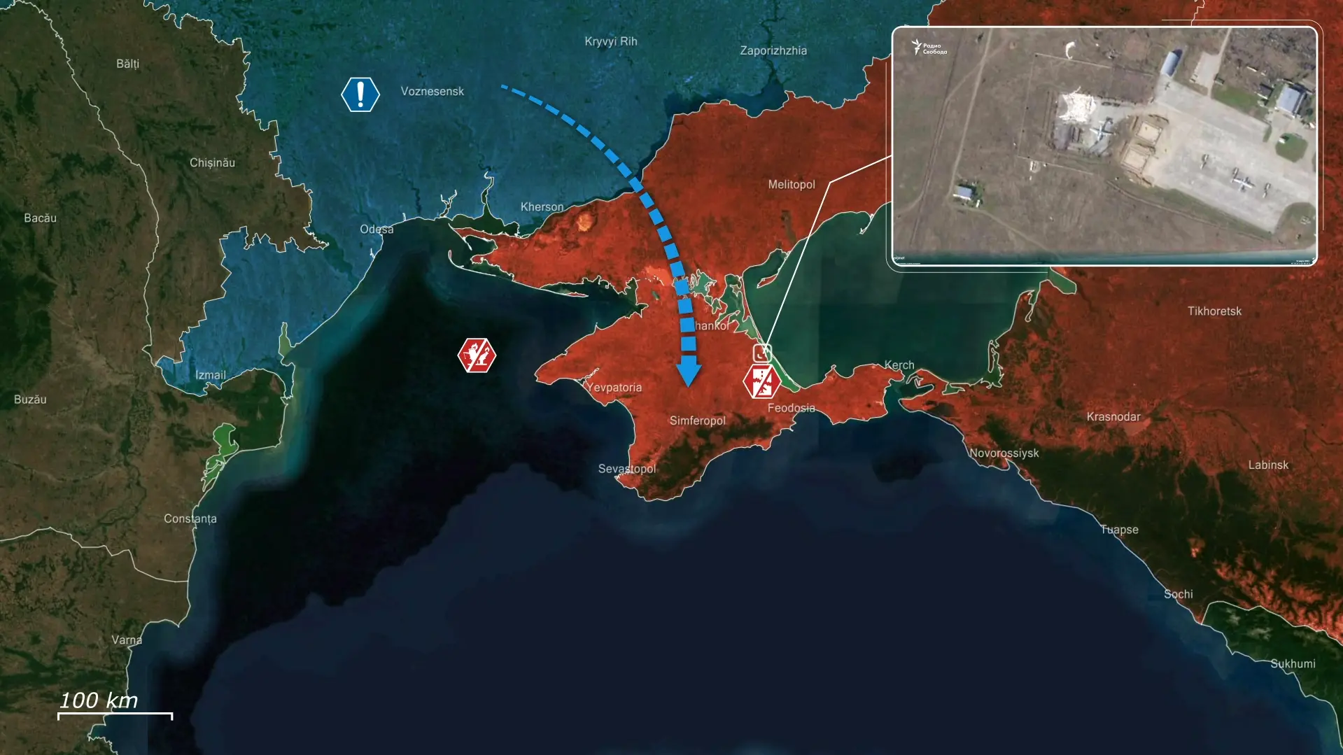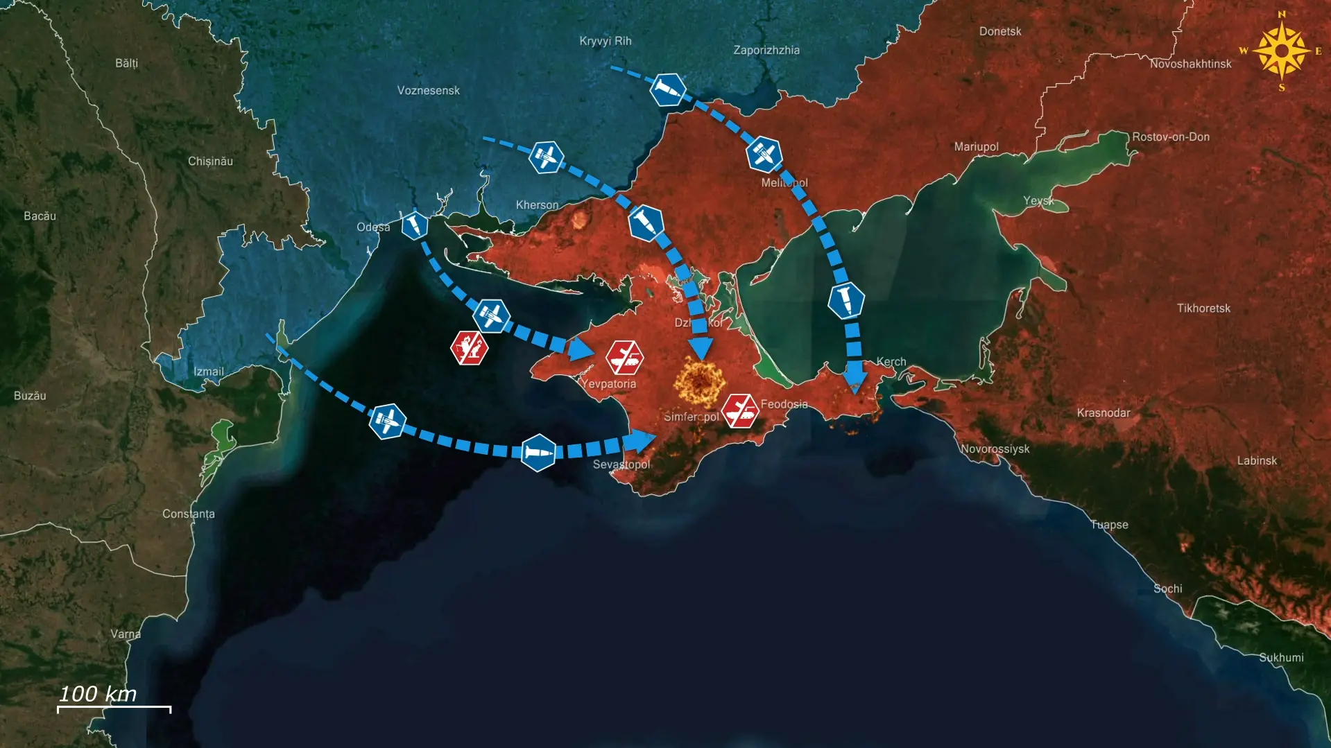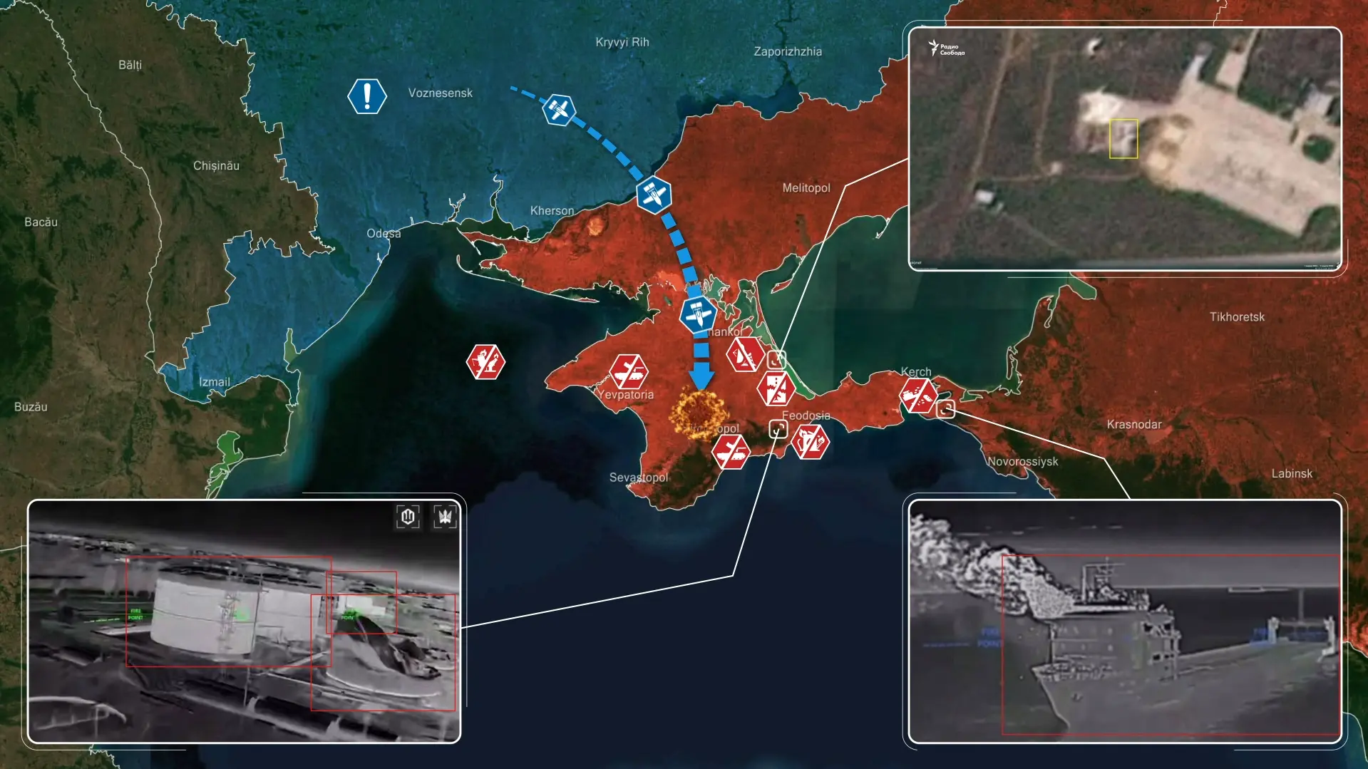 Als onderdeel van deze inspanningen ontmantelden Oekraïense langeafstandsdrones systematisch Russische luchtverdediging en logistieke knooppunten op de Krim. Buk- en Tor-systemen werden vernietigd samen met een Zoopark-radar, wat een vernietigende aanval op het brandstofdepot in Feodosija mogelijk maakte, waar enorme branden uitbraken die van op meer dan twintig kilometer afstand zichtbaar waren.