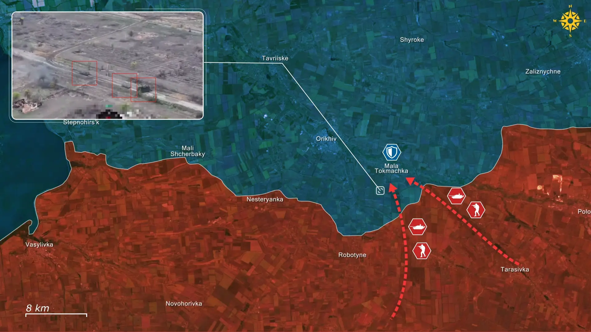 De Russische opmars richting Orikhiv bestond uit een meergolvige aanval op Mala Tokmachka, met als doel door te breken en het gebied te consolideren. Geolokaliseerde beelden tonen Russische troepen die gedurende de dag met 26 tanks en infanteriegevechtsvoertuigen oprukken, maar ondanks hun inspanningen werden er tegen de avond 22 vernietigd door de Oekraïners. De meeste soldaten werden ook geëlimineerd, terwijl overlevenden door hun eigen commando werden achtergelaten als doelwit voor de Oekraïense drones die het terrein zuiverden.