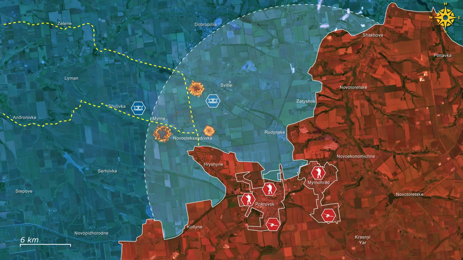 Momenteel concentreren de Russen zich op het verkrijgen van controle over het gebied rond Pokrovsk en Myrnohrad, nadat zij de steden reeds hebben ingenomen. Dit moet de Russen een veiligere troepenconcentratie in de steden bieden, mits zij erin slagen de Oekraïners, en met name de drone-operatoren, verder terug te dringen. De Russen zijn al begonnen met het verplaatsen van artillerie naar de zuidelijke buitenwijken van de stad, wat erop wijst dat dit gebied zich nu buiten het bereik van standaard Oekraïense drones bevindt. Daarnaast hebben de Russen een kill zone gecreëerd binnen een straal van twintig kilometer rond het centrum van Myrnohrad en vallen zij alles aan wat beweegt, wat de Oekraïense activiteiten in het gebied bemoeilijkt. Hiermee hebben de Russen hun primaire doel bereikt om deze route onder vuurcontrole te brengen, waardoor de logistiek naar Hryshyne aanzienlijk is verstoord en de verdedigende eenheden afhankelijk zijn van bevoorrading via drones.