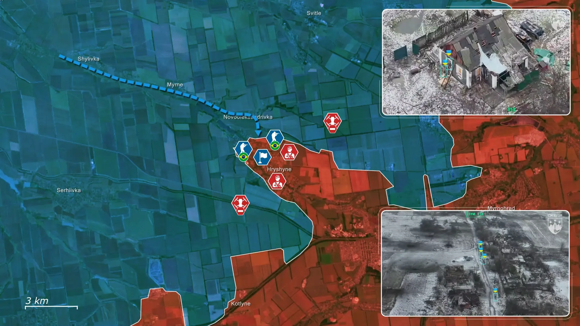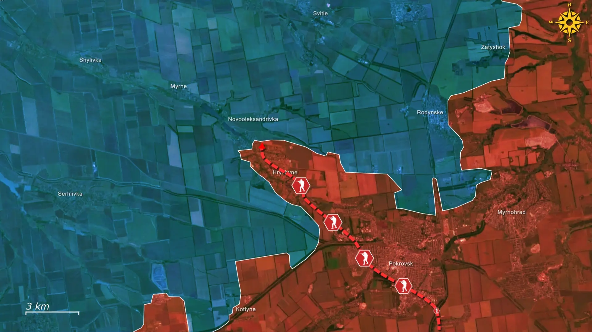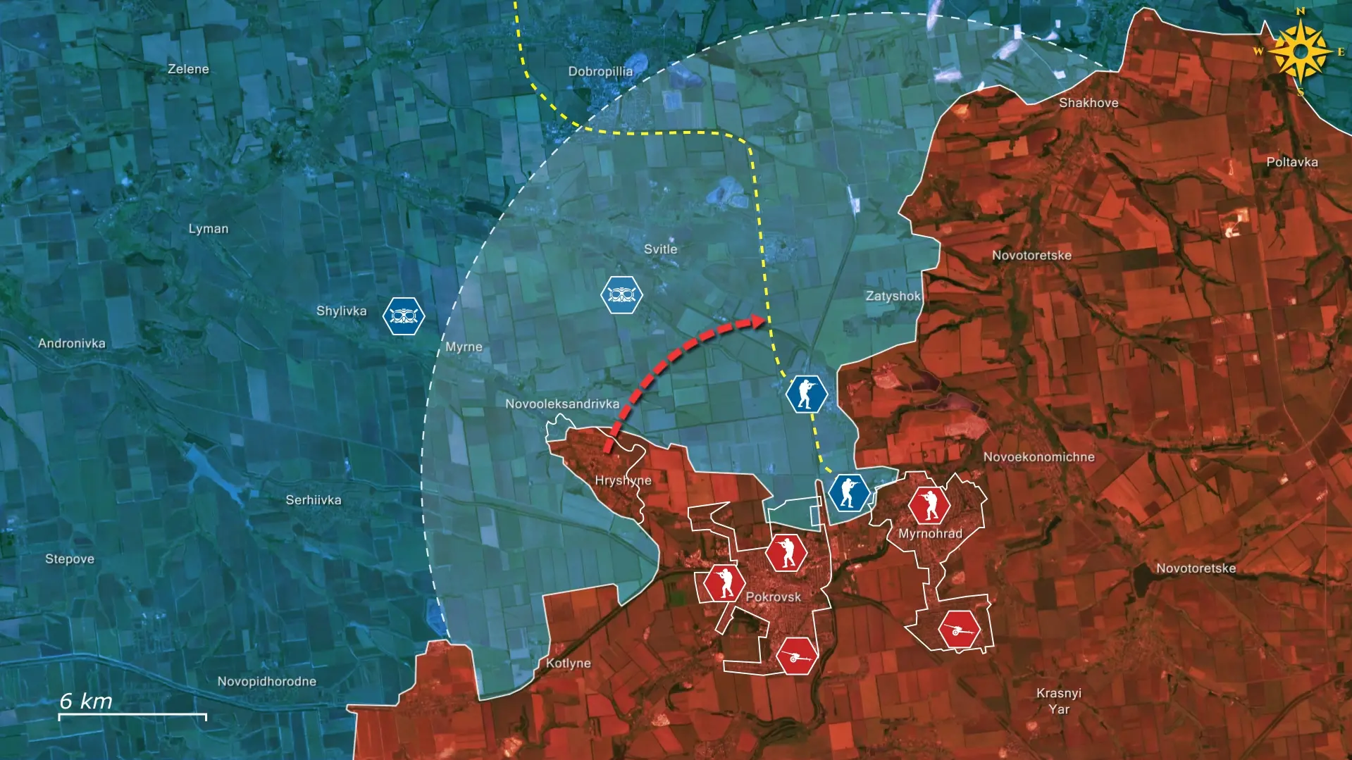 Het Russische plan is om op te rukken van Hryshyne naar Shylivka en verder, via de snelweg naar Pavlohrad. De Oekraïners moeten de volledige inname van Hryshyne voorkomen, omdat een Russische doorbraak de bredere Pokrovsk-as zou kunnen destabiliseren en als springplank zou kunnen dienen voor een aanval naar het westen.