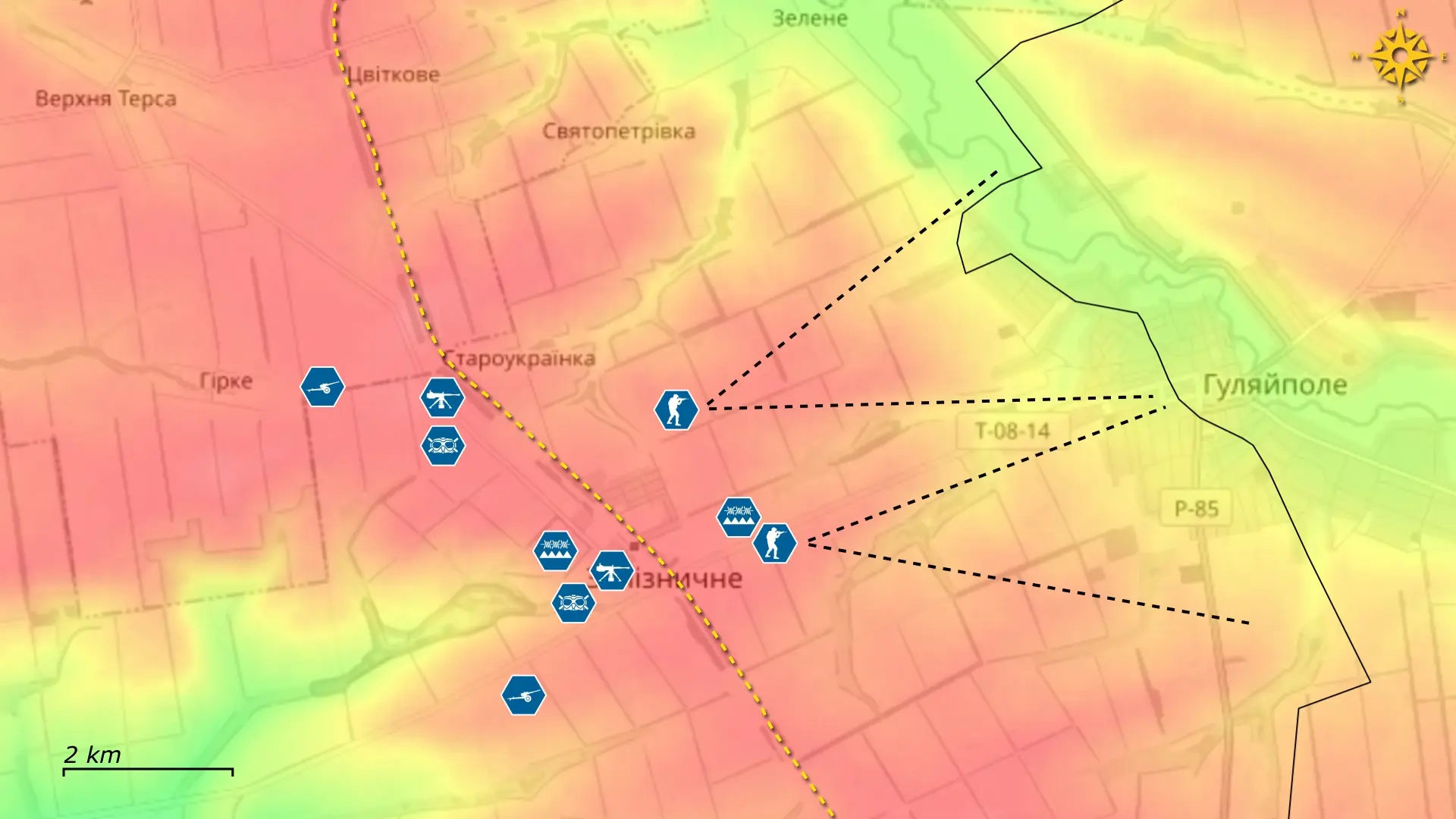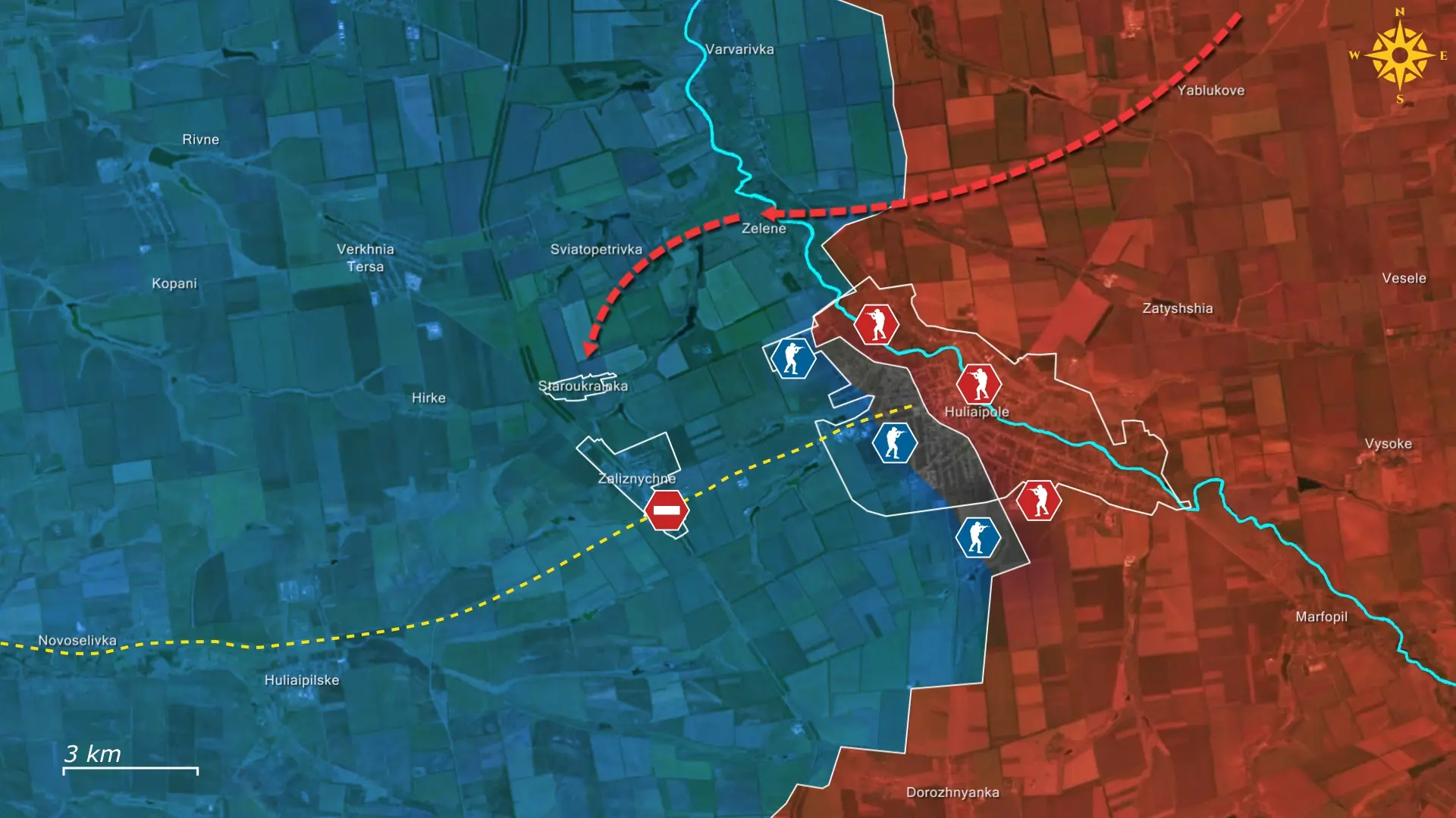 Hoewel de Oekraïense posities ten westen van Huliaipole coherent blijven, slagen Russische infiltratiegroepen er af en toe in om door de verdedigingswerken te glippen door de droneverkenning te ontwijken. Deze aanvallen zijn bedoeld om chaos achter de Oekraïense linies te veroorzaken, met als doel Staroukrainka en Zaliznychne te bereiken om de doorbraak te verbreden.