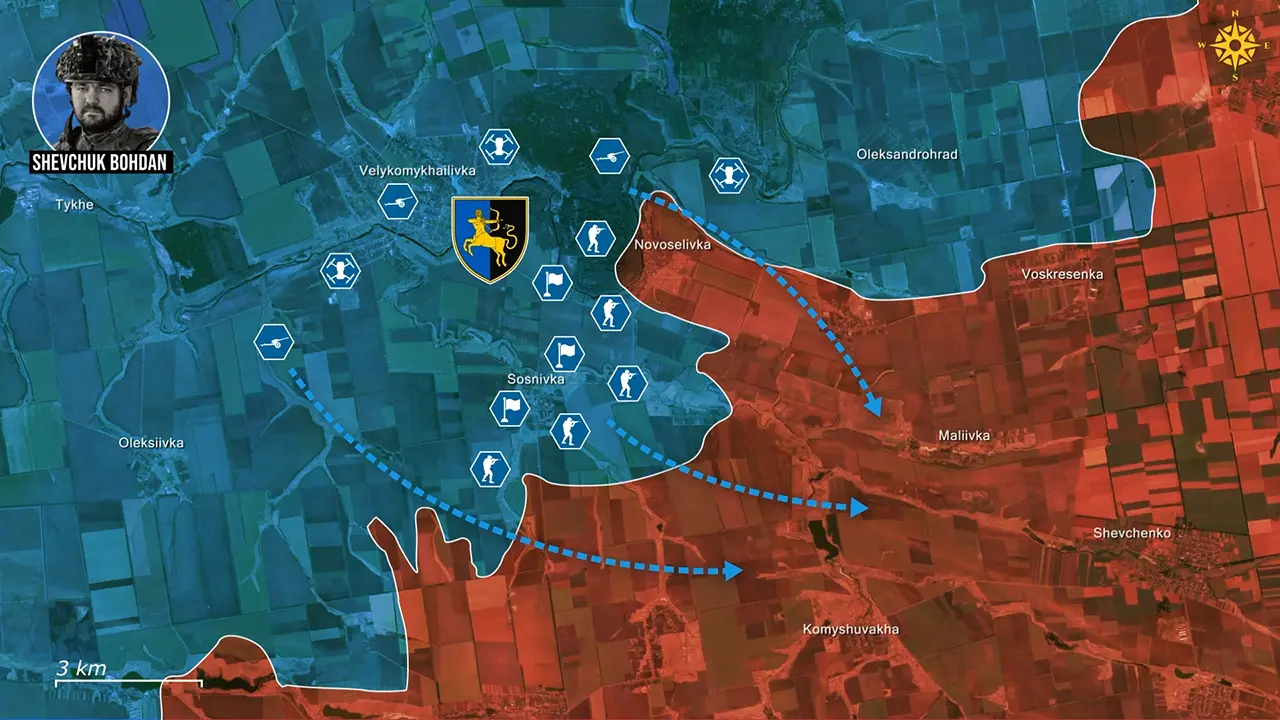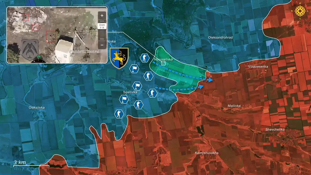 Beelden uit Novoselivka tonen FPV-teams die directe vuurondersteuning bieden aan oprukkende Oekraïense squads, bewegende doelen markeren en korte-afstand infanteriegroepen aanvallen terwijl ze proberen binnen te dringen. Latere clips tonen dezelfde FPV-ploegen die Russische pogingen tot omzeiling van de brigade onderscheppen en aanvallen, inclusief kleine groepen die probeerden Oleksiivka en aangrenzende paden te gebruiken, waarbij herhaaldelijk Russische omzeilingspogingen werden gestopt voordat Oekraïense artillerie of infanterie zelfs hoefde in te grijpen.