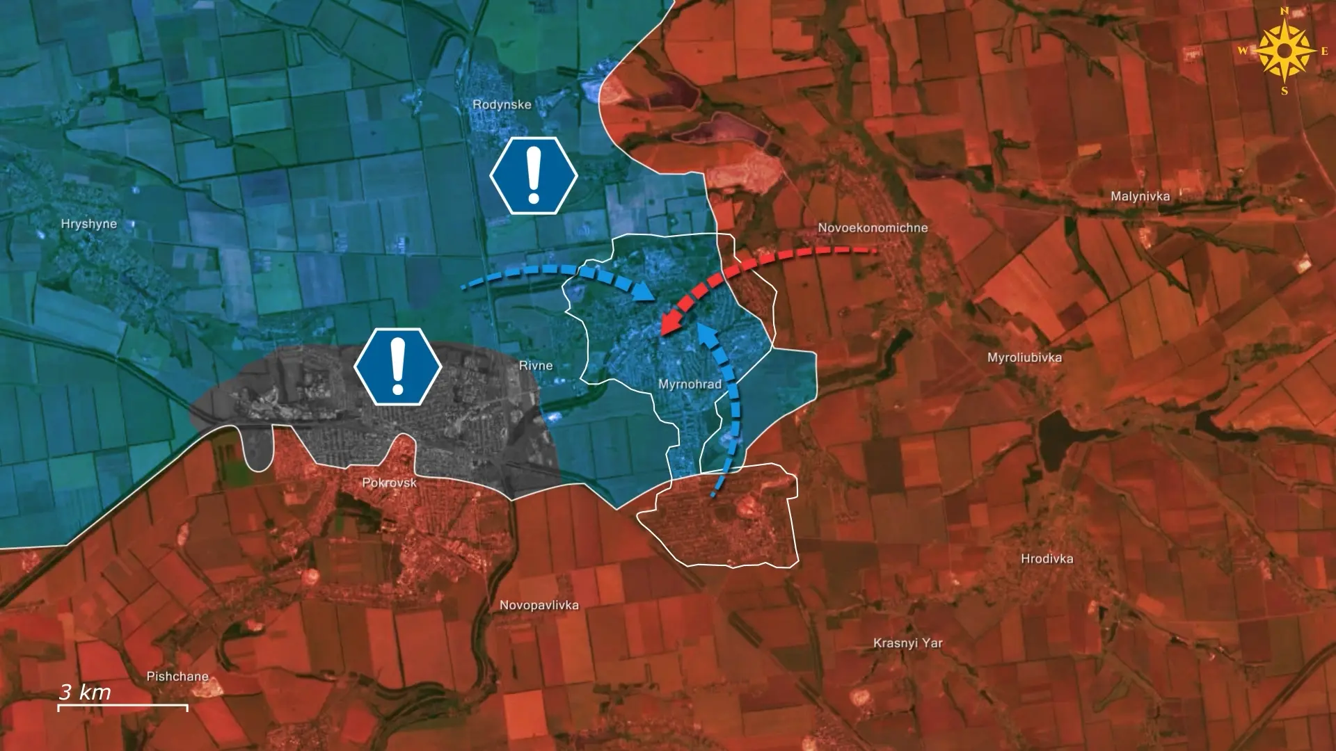 De Russen voeren aanvallen uit vanuit zowel het oosten als het westen, maar zonder volledige controle over het noordelijke deel van Pokrovsk kunnen ze dit niet effectief gebruiken als springplank en missen ze de middelen om de voordelen volledig te benutten. Slechte weersomstandigheden, zoals mist, helpen de aanvallers hun beweging te verbergen en ongemerkt op te rukken vanwege het lage zicht, maar het helpt de Oekraïners ook om hinderlagen te organiseren. Het niveau van succesvolle Oekraïense tegenmaatregelen toont aan dat ook de Russische drones worden beïnvloed, waarbij vijandelijke operatoren niet in staat zijn voldoende drone-surveillance te bieden.