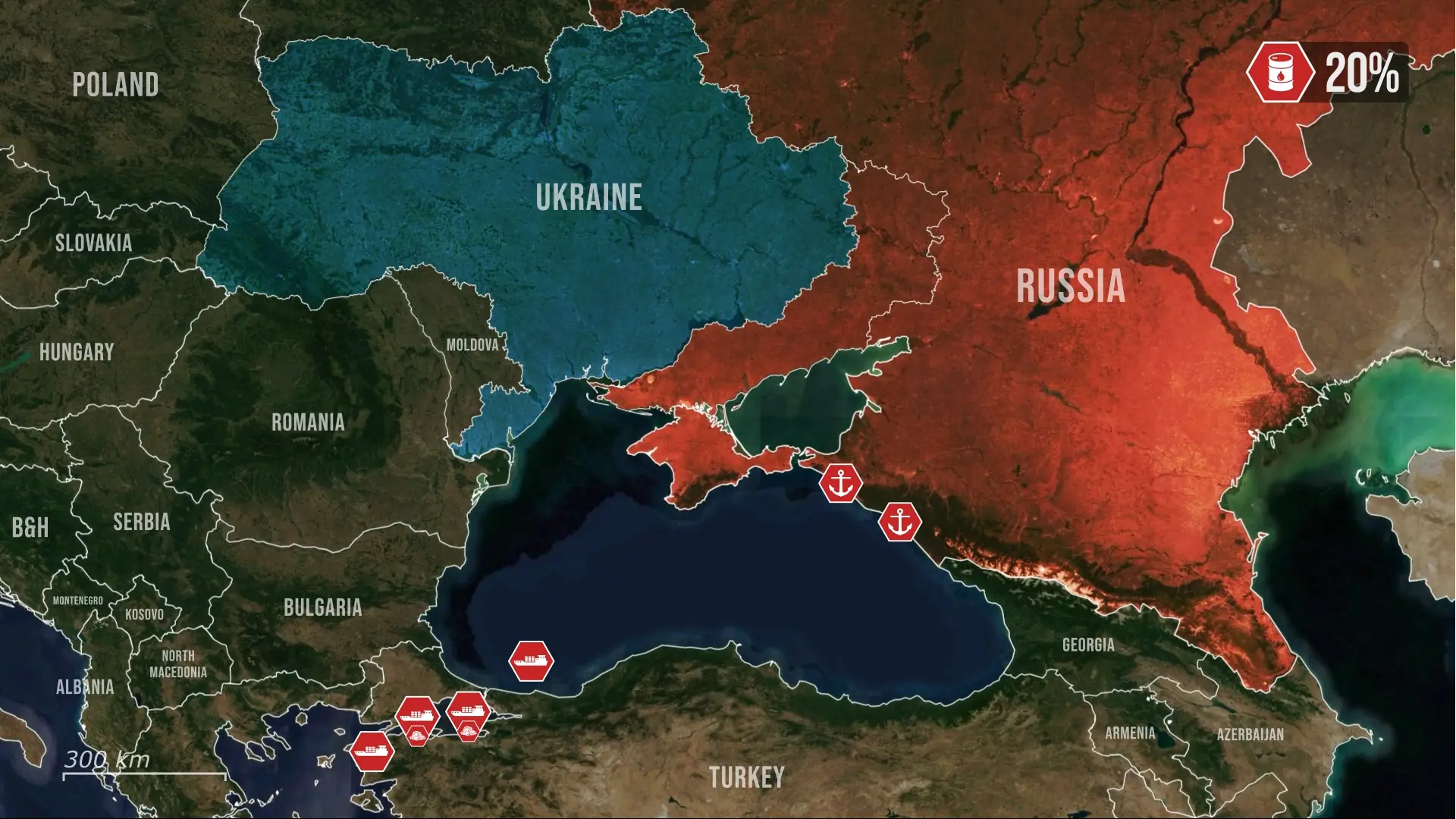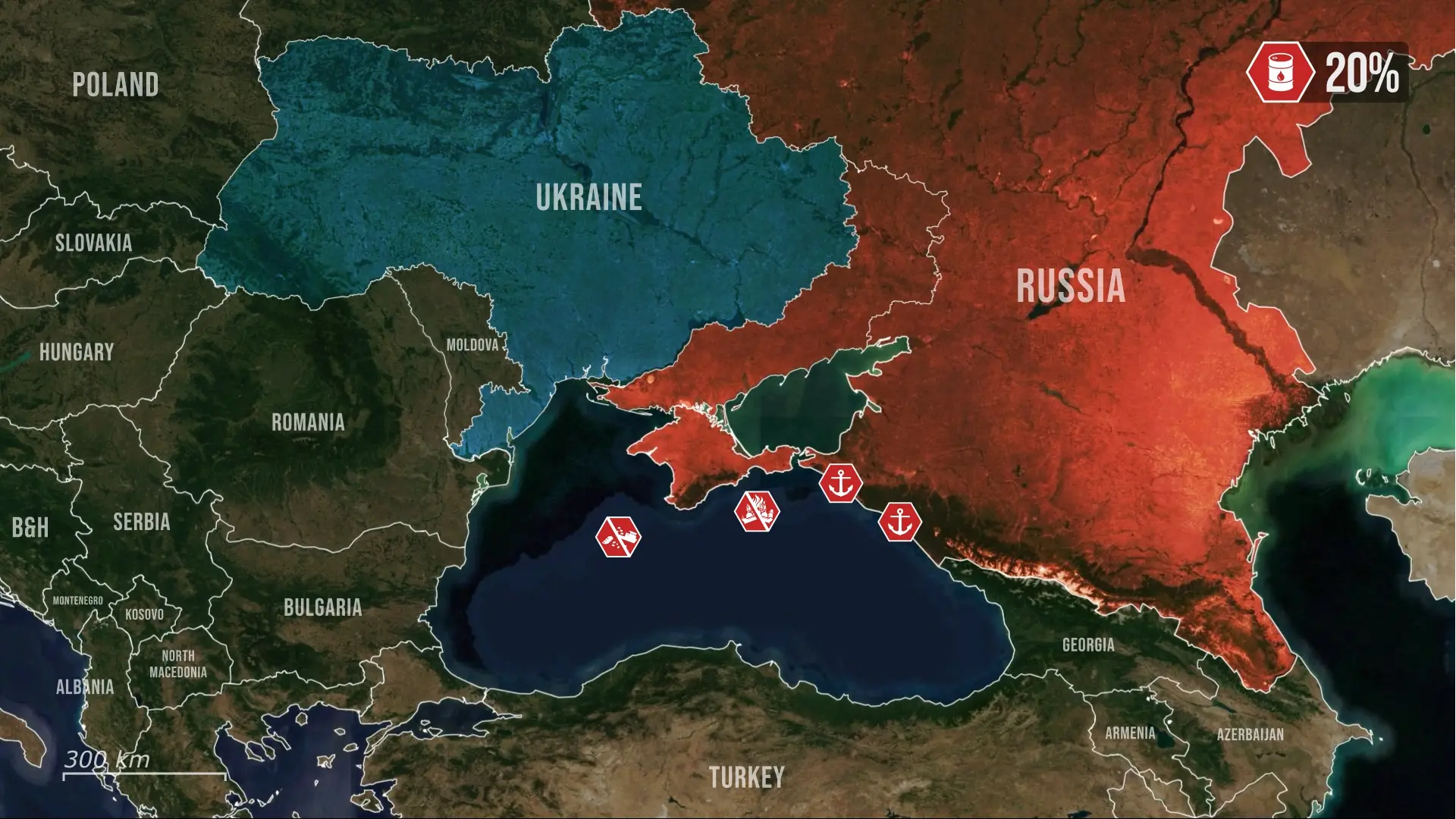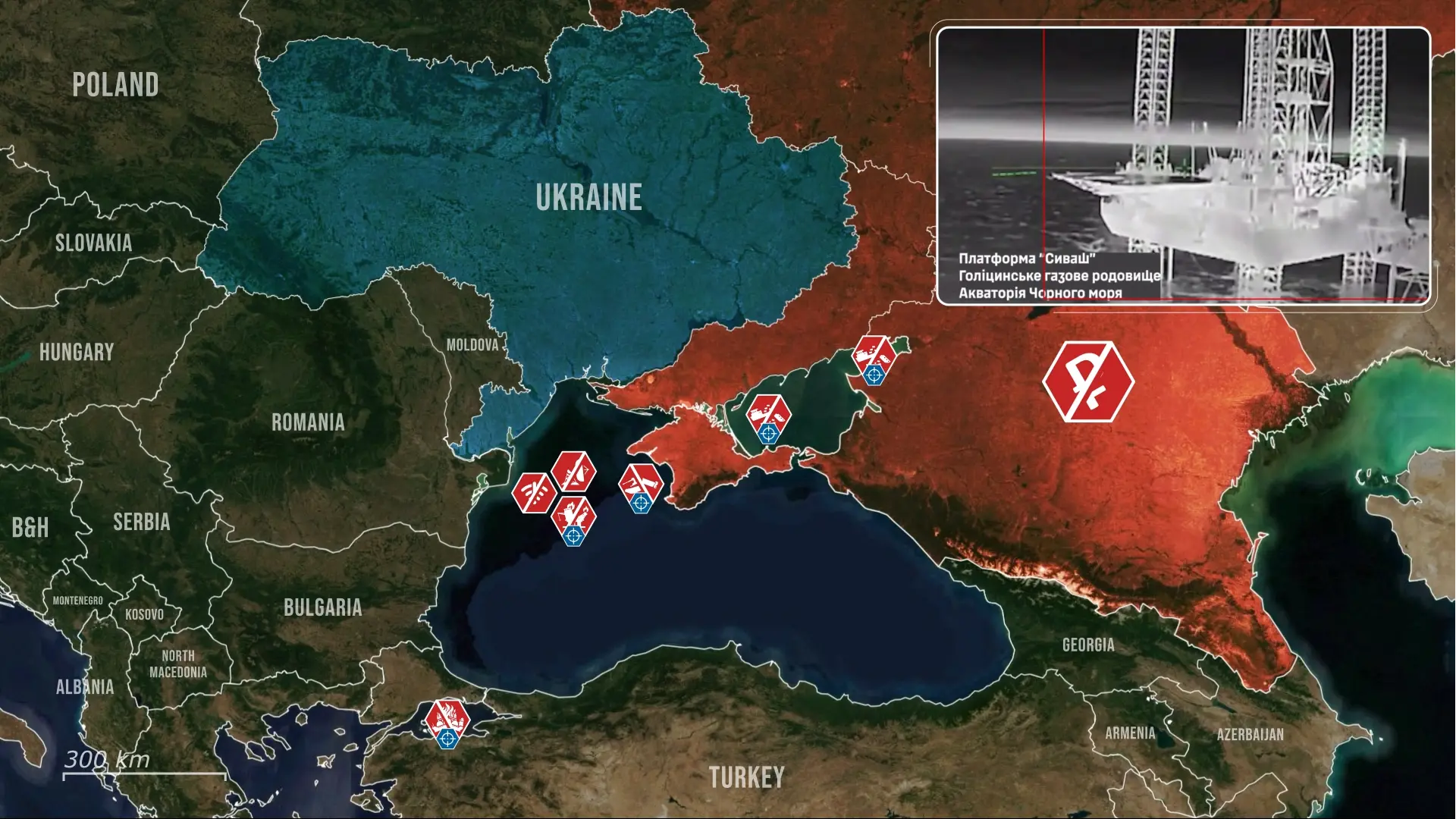 Ponadto rosyjskie siły stacjonujące na platformie wiertniczej stały się celem dronów kamikadze. Platforma ta była wykorzystywana jako punkt obserwacyjny i węzeł walki elektronicznej, wyposażony w retransmitery UAV, radary oraz systemy obrony przeciwlotniczej. Uderzenie to miało na celu stworzenie luk w rosyjskiej obronie powietrznej oraz ograniczenie zasięgu operacyjnego ich dronów w tym obszarze. Całość tych działań wskazuje na skoordynowaną kampanię mającą na celu zdławienie rosyjskich arterii ekonomicznych i erozję skuteczności militarnej na całym Morzu Czarnym, a nie na serię odosobnionych incydentów.