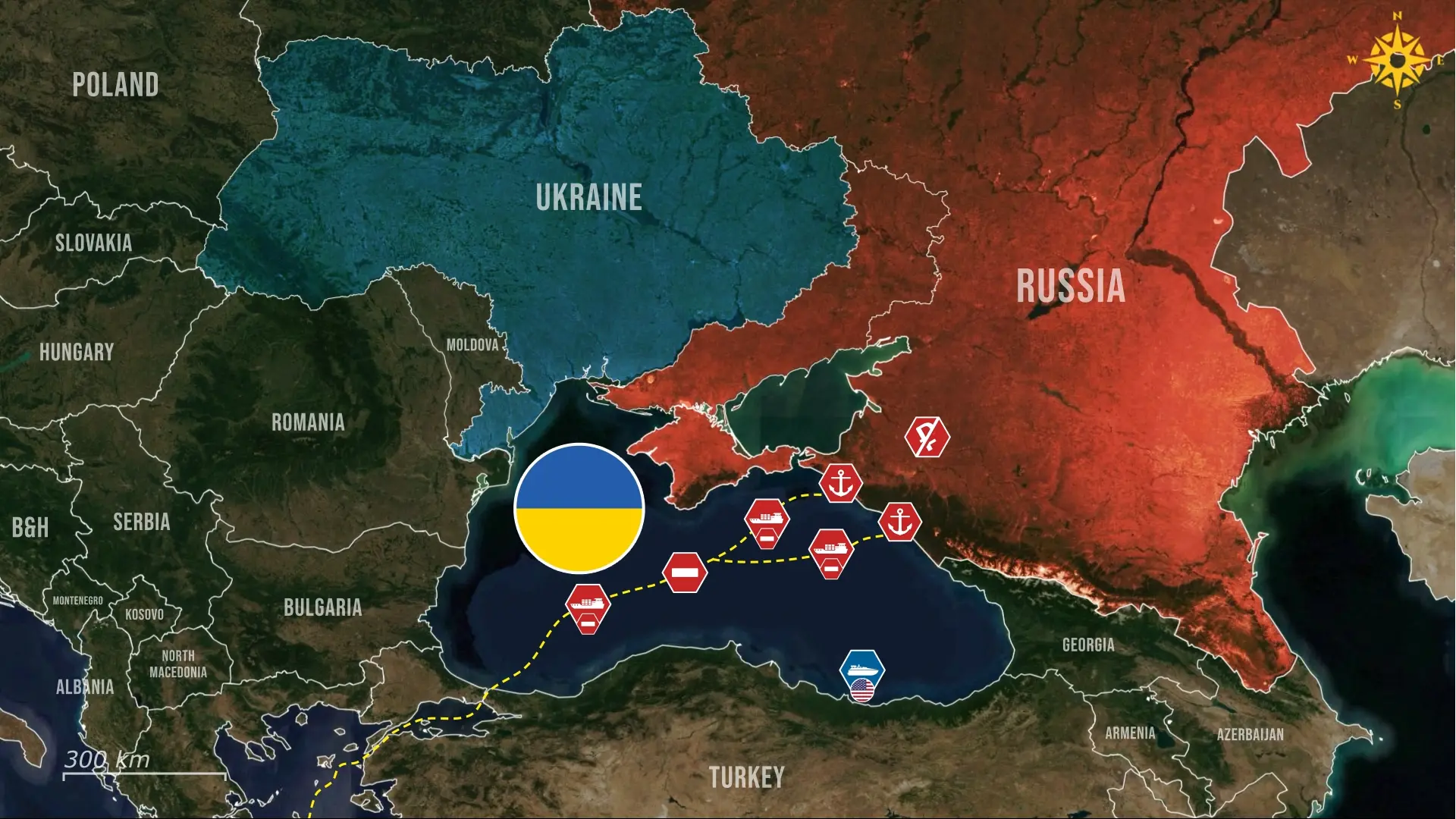 Na mocy Konwencji z Montreux dotyczącej reżimu cieśnin, Turcja posiada uprawnienia do ograniczania lub blokowania przelotu okrętów wojennych przez Bosfor i Dardanele w czasie konfliktu, co skutecznie limituje ruchy rosyjskiej marynarki wojennej do i z Morza Czarnego.