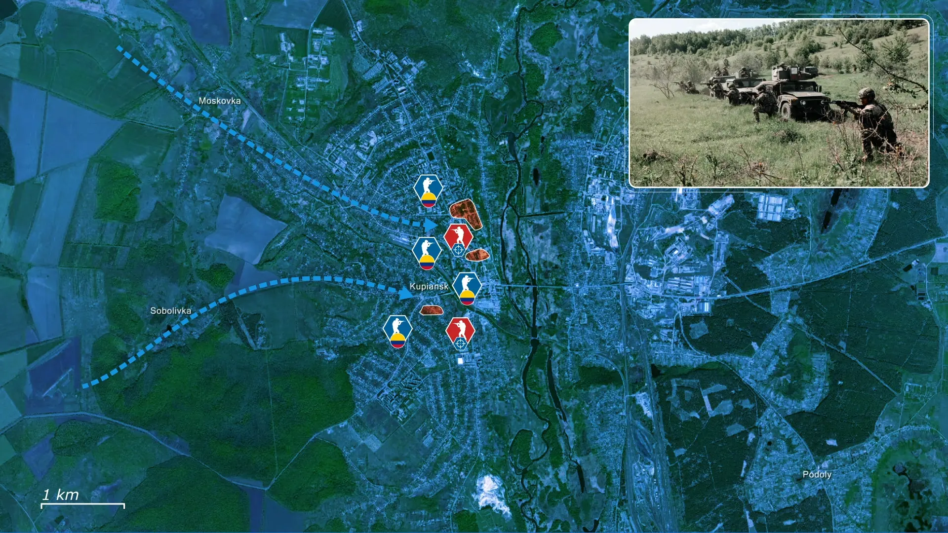 Ukraińskie dowództwo skierowało Grupę Rozpoznawczo-Szturmową (Reconnaissance and Strike Group – RUG) do Kupiańska, formację szturmową stworzoną przez kolumbijskich ochotników wraz z innymi hiszpańskojęzycznymi bojownikami z Ameryki Południowej, wchodzącą w skład 13. Brygady Khartia. Wielu jej żołnierzy to byli weterani wojskowi z wieloletnim doświadczeniem bojowym przeciwko ruchom partyzanckim i zorganizowanej przestępczości, co czyni ich wysoce odpowiednimi do skomplikowanej wojny miejskiej i nieregularnej. Z tego powodu zostali skierowani specjalnie, aby pomóc w okrążeniu i rozbiciu pozostałej rosyjskiej obecności w Kupiańsku.