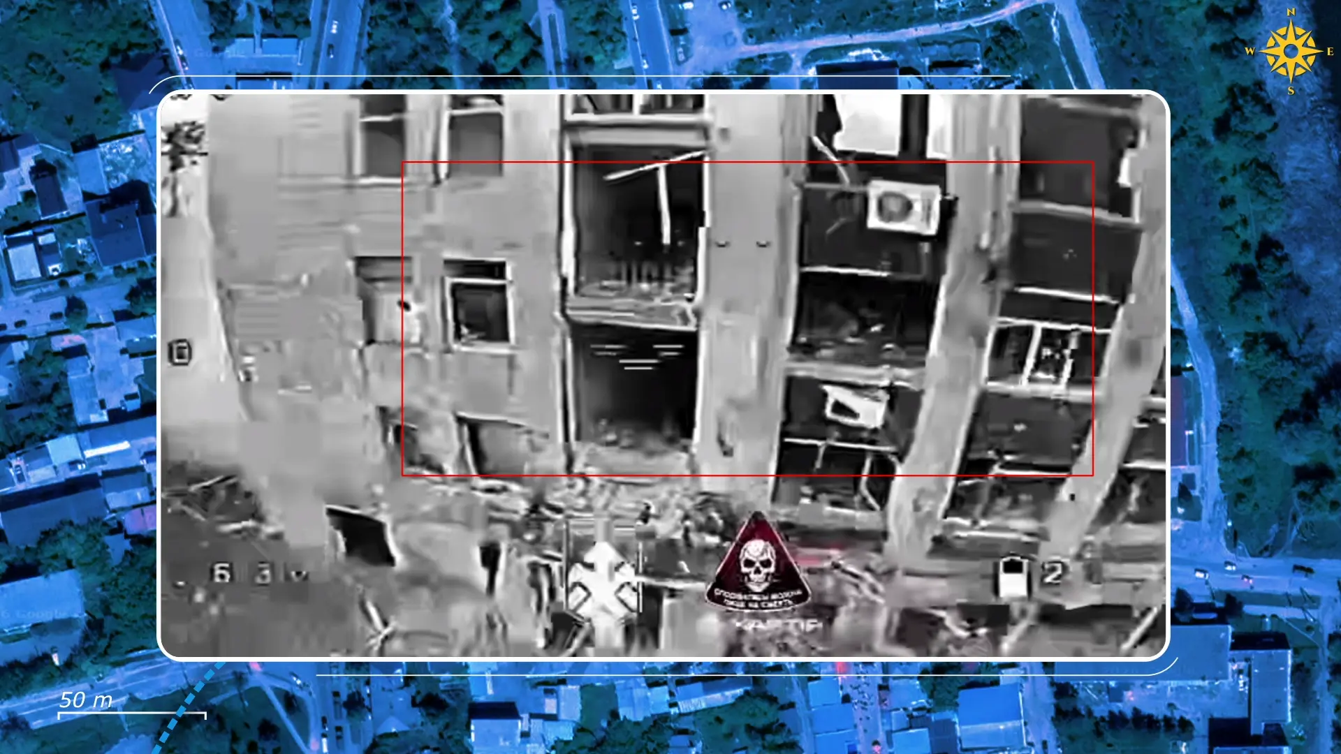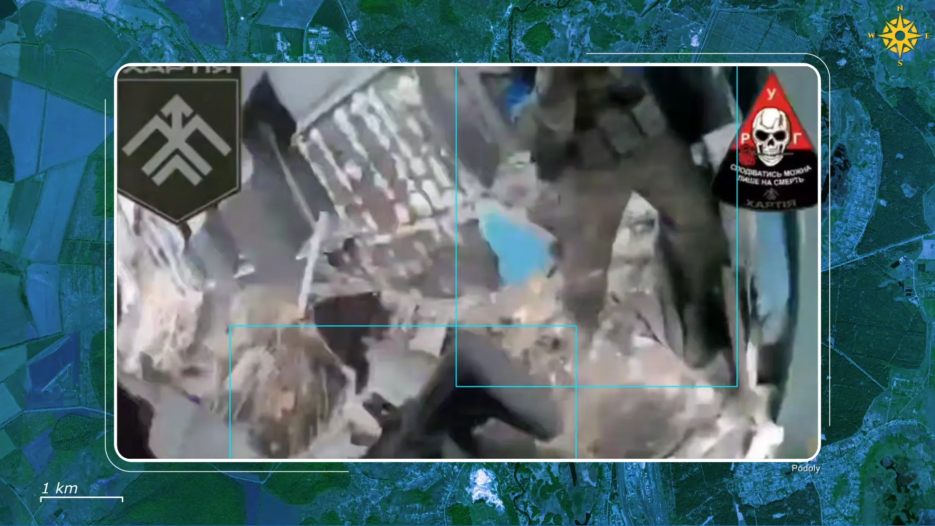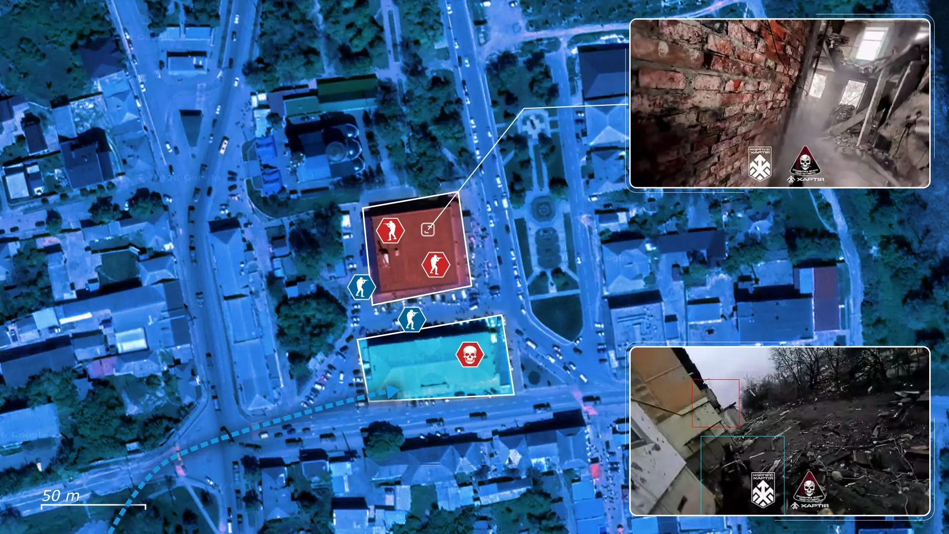 Dzięki temu nadzorowi na ziemi i ciągłej pracy operatorów dronów, ukraińskie dowództwo zidentyfikowało grupę rosyjskich żołnierzy ukrywających się w i wokół budynku rady miejskiej Kupiańska, który znajduje się na stosunkowo otwartym placu, oferującym Rosjanom dobre kąty obserwacyjne i ostrzału.