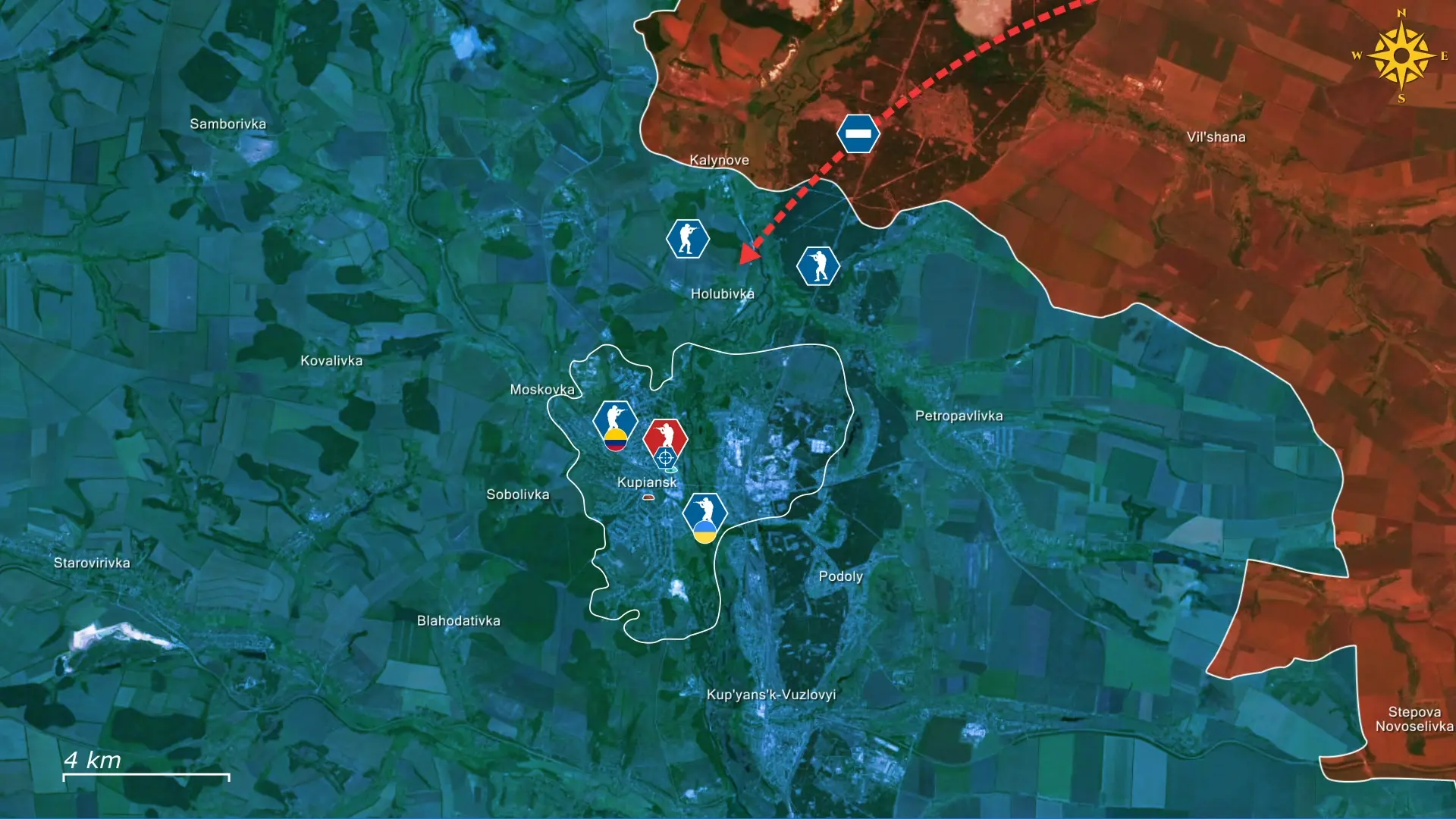 Wykorzystując zimową aurę, Rosjanie próbowali kilkakrotnie przekroczyć zamarzniętą rzekę Oskil na północ od Kupiańska. Choć lód chwilowo ułatwiał ruch, ukraińskie siły kontrolowały oba brzegi rzeki w pobliżu Kupiańska, czyniąc przeprawę niemal niemożliwą. Według rzecznika ukraińskiego, Wiktora Tregubowa, rosyjskie jednostki osiągnęły jedynie ograniczone, tymczasowe przyczółki, zanim zostały wypchnięte przez ataki dronów i ogień artylerii.