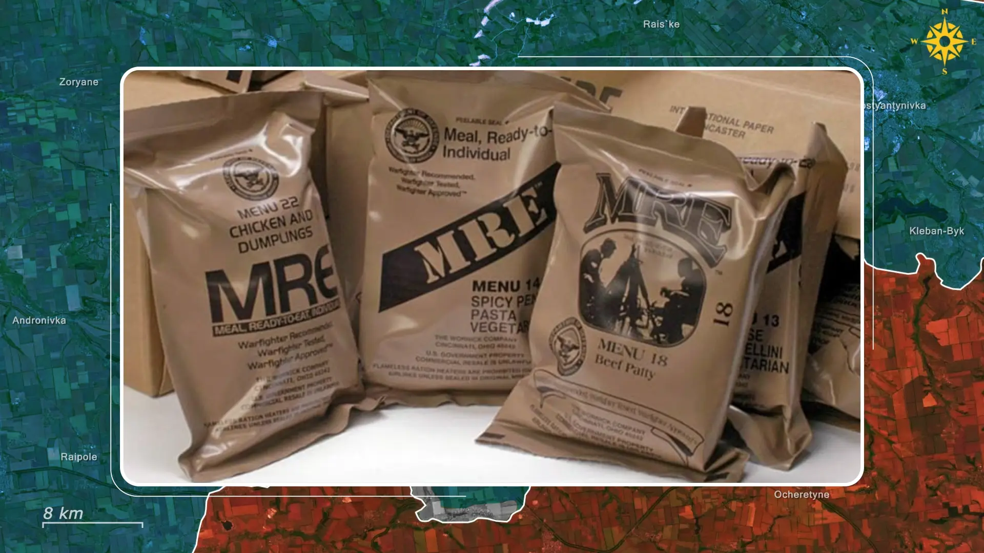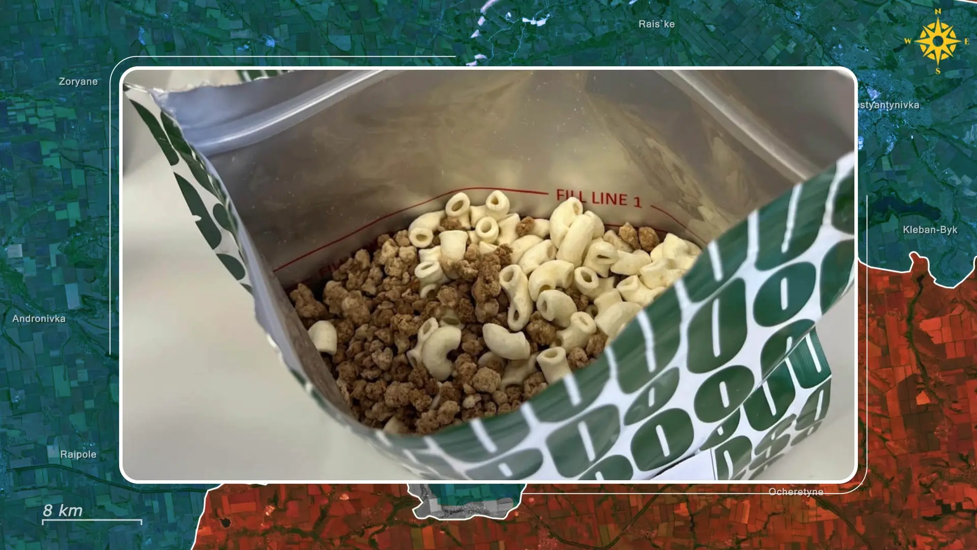 Standardowe racje armijne okazują się bezużyteczne: pojedyncza paczka o wadze 1,2 kilograma niszczy wirniki, konserwy dodają zbędnego ciężaru, więc żołnierze otrzymują przekąski kupione przez wolontariuszy — czekoladę i orzechy — które podnoszą poziom cukru, po czym powodują gwałtowny spadek energii, co sami rosyjscy żołnierze krytykują. Nie istnieje uniwersalny mechanizm zrzutu, więc operatorzy przywiązują ładunki sznurkiem lub taśmą, ryzykując ich utratę w locie. Wymiana baterii w dronach konkuruje z załadunkiem żywności, tworząc błędne koło wyczerpania.