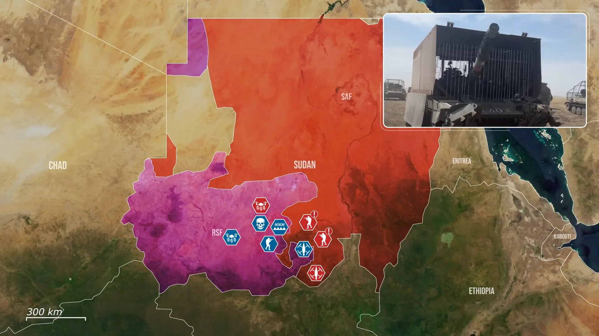 RSF jako pierwsze wprowadziło drony na sudańskie pole bitwy, co początkowo zapewniło tej frakcji przewagę. RSF wykorzystuje maszyny CH-95 oraz zmodyfikowane komercyjne quadrocoptery zdolne do przenoszenia pocisków moździerzowych. Obecnie obie strony operują szeroką gamą systemów, w tym dronami dalekiego zasięgu, takimi jak Bayraktar TB2 oraz dostarczane przez Iran Mohajer-6, znajdujące się na wyposażeniu sił SAF.